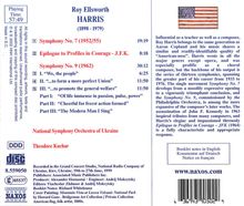 Die Ermordung John F. Kennedys 1963 inspirierte viele Komponisten zu Hommagen, nicht zuletzt Leonard Bernstein (Symphonie Nr. 3, "Kaddish") und Roger Sessions (Klaviersonate Nr. 3). Harris' Epilog zu Profiles in Courage - J. F.K. (1964) ist eine völlig charakteristische und angemessene Stellungnahme. Elegische und leidenschaftliche Streicher, verstärkt durch Blechbläser und gekrönt von Röhrenglocken, bestimmen die Stimmung des Stückes und den Gedenkzweck, dem es dient. Große Trommel und Seitentrommel tragen zu einer kurzzeitigen Steigerung der rhythmischen Intensität bei, aber die anfängliche Sehnsuchtsqualität kehrt bald wieder zurück. Eine unerbittliche Bewegung auf den Pauken untermauert die sich intensivierende Streicherthrenodie, und das Werk schließt ruhig, mit einem Gefühl der ruhigen Erinnerung.