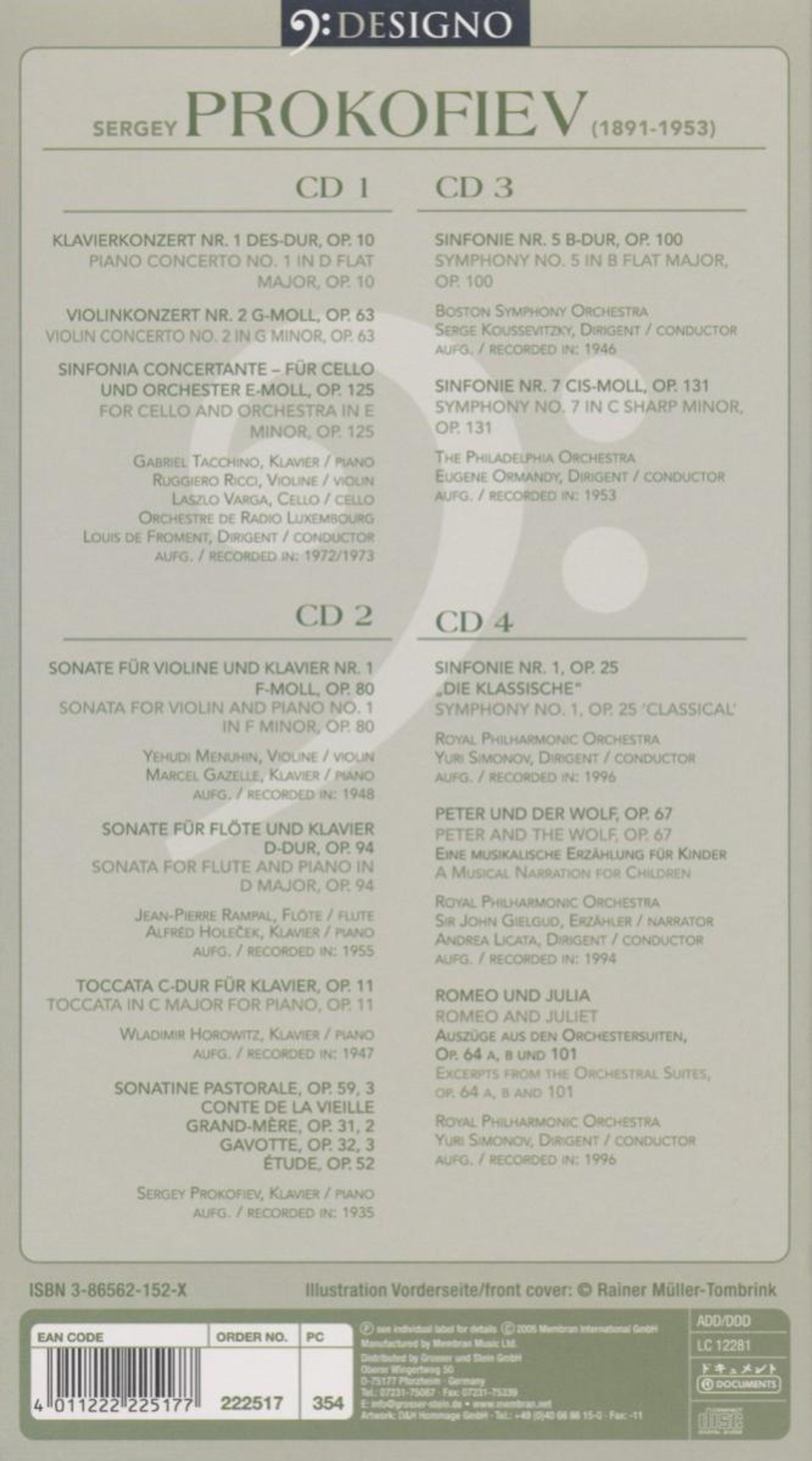 +Klavierkonzert Nr. 1; Violinkonzert Nr. 2; Sinfonia concertante op. 125; Sonate für Violine & Klavier Nr. 1; Sonate für Flöte & Klavier op. 94; Toccata op. 11; Sonatine Pastorale op. 59, 3; Conte de la Vieille; Grand-Mere op. 31, 2; Gavotte op. 32, 3; Etude op. 52; Peter & der Wolf; Romeo & Julia
