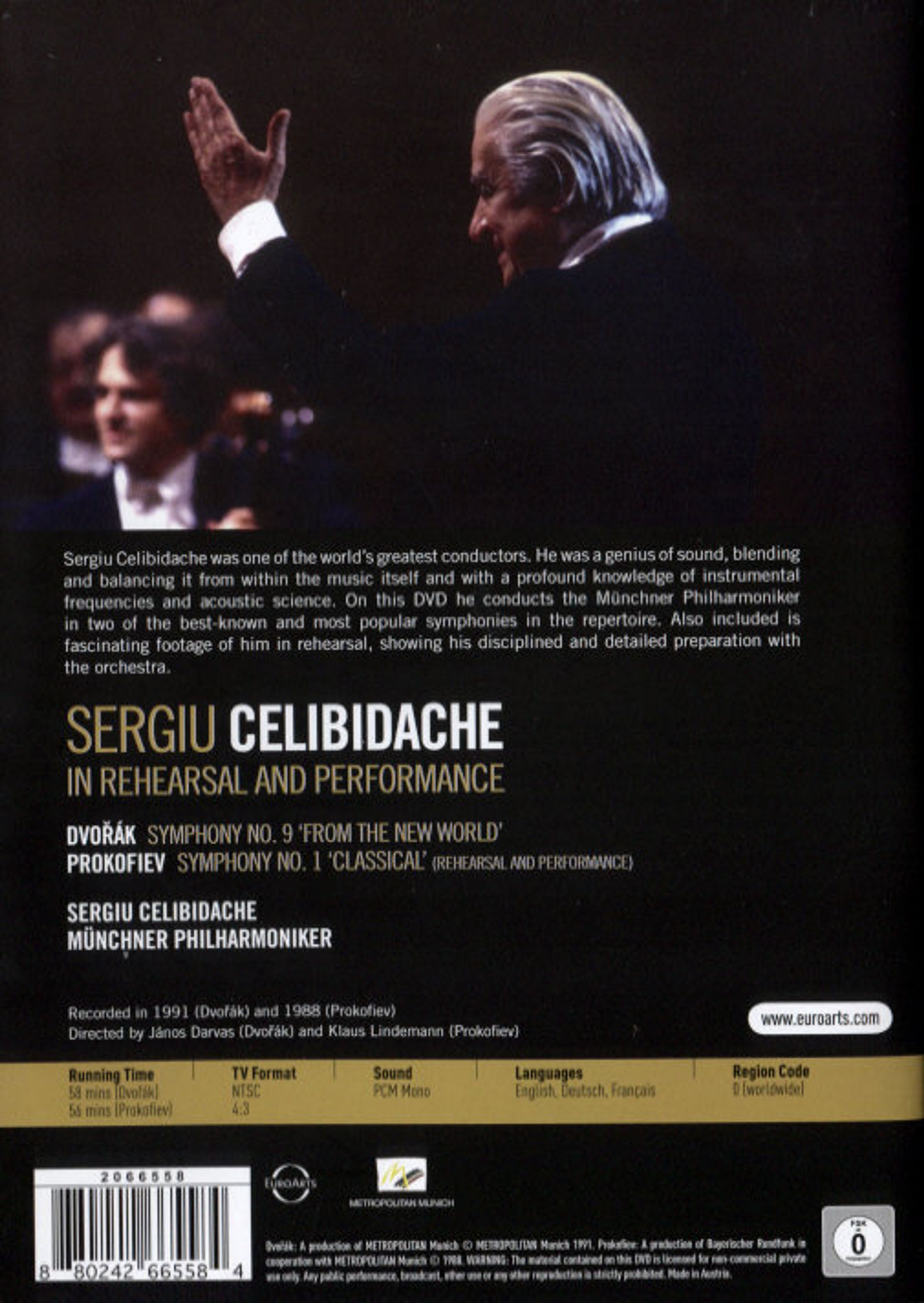 FonoForum 12/11: "Dvoraks Sinfonie "Aus der Neuen Welt" erlebte 1991 im Münchner Gasteig eine imposante, sorgfältig disponierte Aufführung, deren gemäßigte Tempi einen ungeahnten Reichtum an kompositorischen Details hörbar machen. Drei Jahre früher entstand der Film mit Probe und Aufführung der "Symphonie classique" von Sergej Prokofjew, deren Witz und Raffinesse Celibidache liebevoll herausarbeitete. Die ausführliche Probe bietet eine gute Gelegenheit, sich mit den Feinheiten (und spieltechnischen Schwierigkeiten) des Werkes vertraut zu machen. Darüber hinaus dokumentiert die DVD Celibidaches ebenso fantasievollen wie funktionellen Dirigierstil, der immer in unmittelbarem Bezug zum beabsichtigten klanglichen Resultat stand."Mehr von Antonin Dvorak