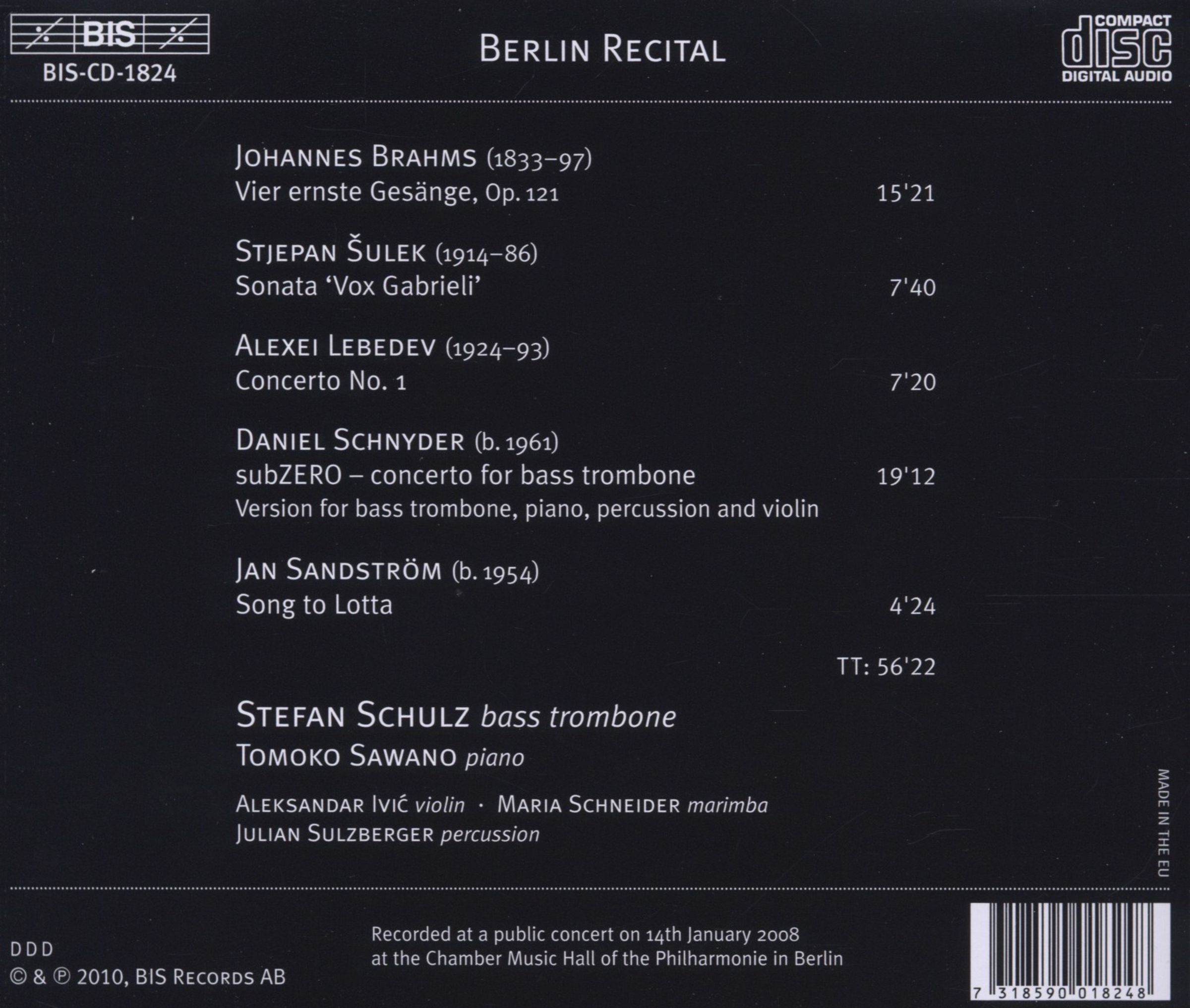 Seit 2002 ist Schulz Mitglied des Berliner Philharmonischen Orchesters und einer der führenden Baßposaunisten weltweit. Dies ist seine erste Solo-CD; ein Recital, das live bei einem Konzert im Kammermusiksaal der Philharmonie aufgenommen wurde. Das Programm wurde gezielt danach ausgesucht, die verschiedenen klanglichen und spieltechnischen Möglichkeiten der Baßposaune aufzuzeigen, insbesondere ihre hervorragende Eignung für die Wiedergabe liedhafter Musik. Und da passen Brahms‘ „Vier ernste Gesänge“ genauso gut wie der wunderbar einfache „Song to Lotta“ von Jan Sandström oder das Konzert „Subzero“ des New Yorker Saxophonisten und Komponisten Daniel Schnyder, das zum Jazz hin tendiert.
