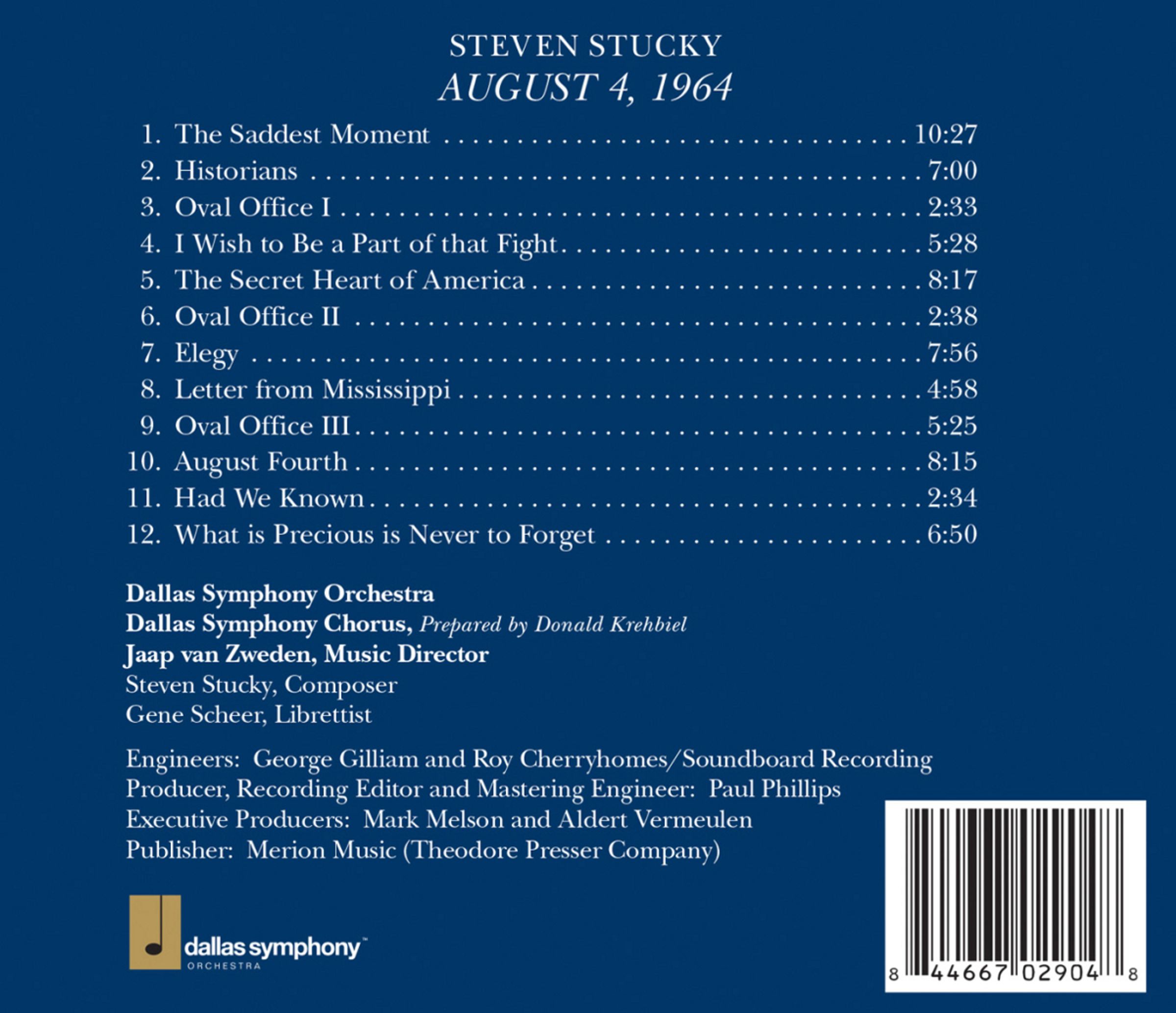 Dies ist die Weltpremiere-Aufnahme von Steven Stuckys „August 4, 1964“, einem „Konzertdrama“, das vom Dallas Symphony Orchestra zu Ehren des 100. Geburtstags von Lyndon Baines Johnson in Auftrag gegeben wurde. Die Weltpremiere fand am 18. September 2008 unter der Leitung von Jaap van Zweden mit dem Dallas Symphony Orchestra und Chor sowie Solisten im Morton H Meyerson Symphony Center in Dallas, Texas, statt. Das Werk konzentriert sich auf einen einzigen Tag in der Amtszeit von Präsident Johnson, an dem Präsident Johnson und Verteidigungsminister Robert McNamara beschlossen, den Vietnamkrieg zu eskalieren, und an dem die Leichen von drei ermordeten Bürgerrechtsaktivisten in Mississippi entdeckt wurden. Das Libretto von Gene Scheer (Jake Heggies Moby Dick; Tobias Pickers An American Tragedy) stellt Telefonmitschnitte aus dem Weißen Haus, Briefe der ermordeten Bürgerrechtler und ihrer Mütter, Reden von Präsident Johnson und andere zeitgenössische Quellen gegenüber. Stuckys Musik unterstreicht die packende Erzählung, die von aktueller Relevanz ist.
