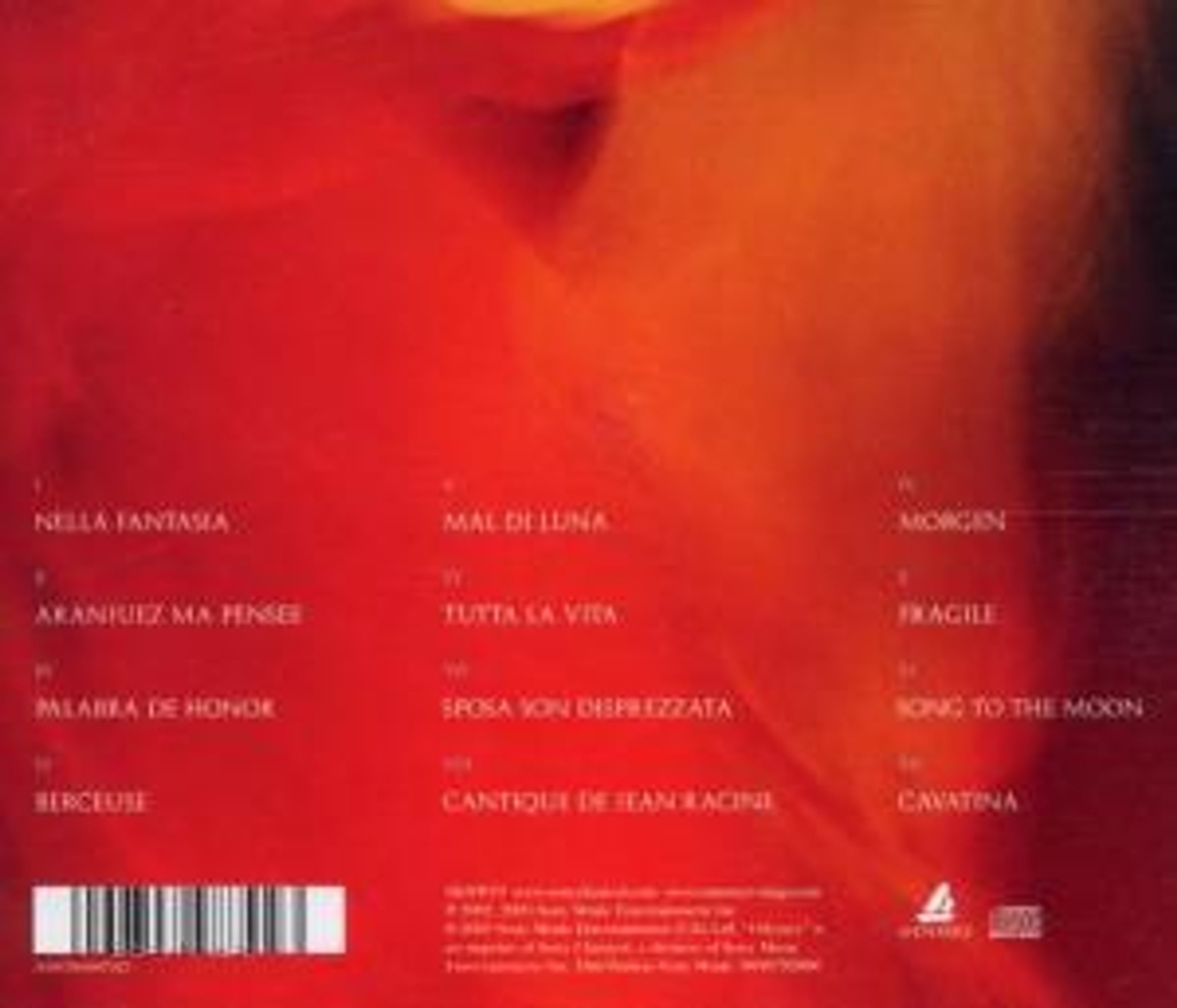 Nella Fantasia (Morricone) 04: 09; Aranjuez Ma Pensee (Kahmi) 04: 18; Palabre De Honor (Musker) 04: 22; Berceuse 04: 35; Mal Di Luna (Musker) (Bearbeitung N. Pat 04: 15; Tutta La Vita (Saggese) 03: 22; Sposa Son Disprezzata (Piovene) (Bearbei 05: 32; Cantique De Jean Racine (Bearbeitung Sum 05: 18; Morgen (Mckay) (Bearbeitung Summer, N. P 04: 10; Fragile (Sting) 04: 01; Song To The Moon (Bearbeitung Summer, N. 05: 40; Cavatina (Laine) 04: 20;