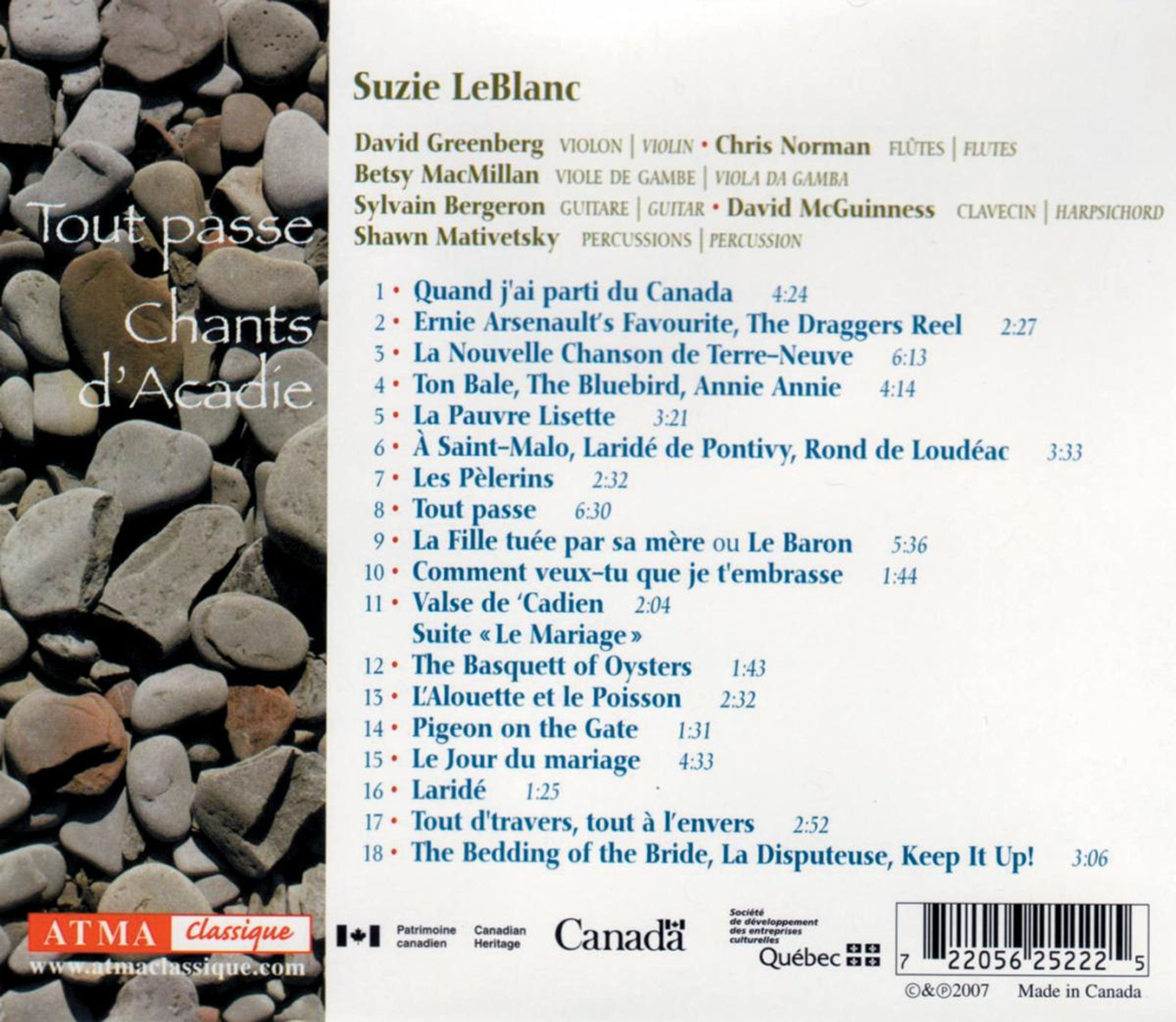 Tout passe ist eine authentische Pilgerreise zu den Quellen Akadiens. In Anlehnung an die vielfältigen Reisen seiner Vorfahren zeugt Tout Passe von ihrer Ausdauer und ihrem Glauben und würdigt den Reichtum ihres musikalischen Erbes. – Suzie LeBlanc