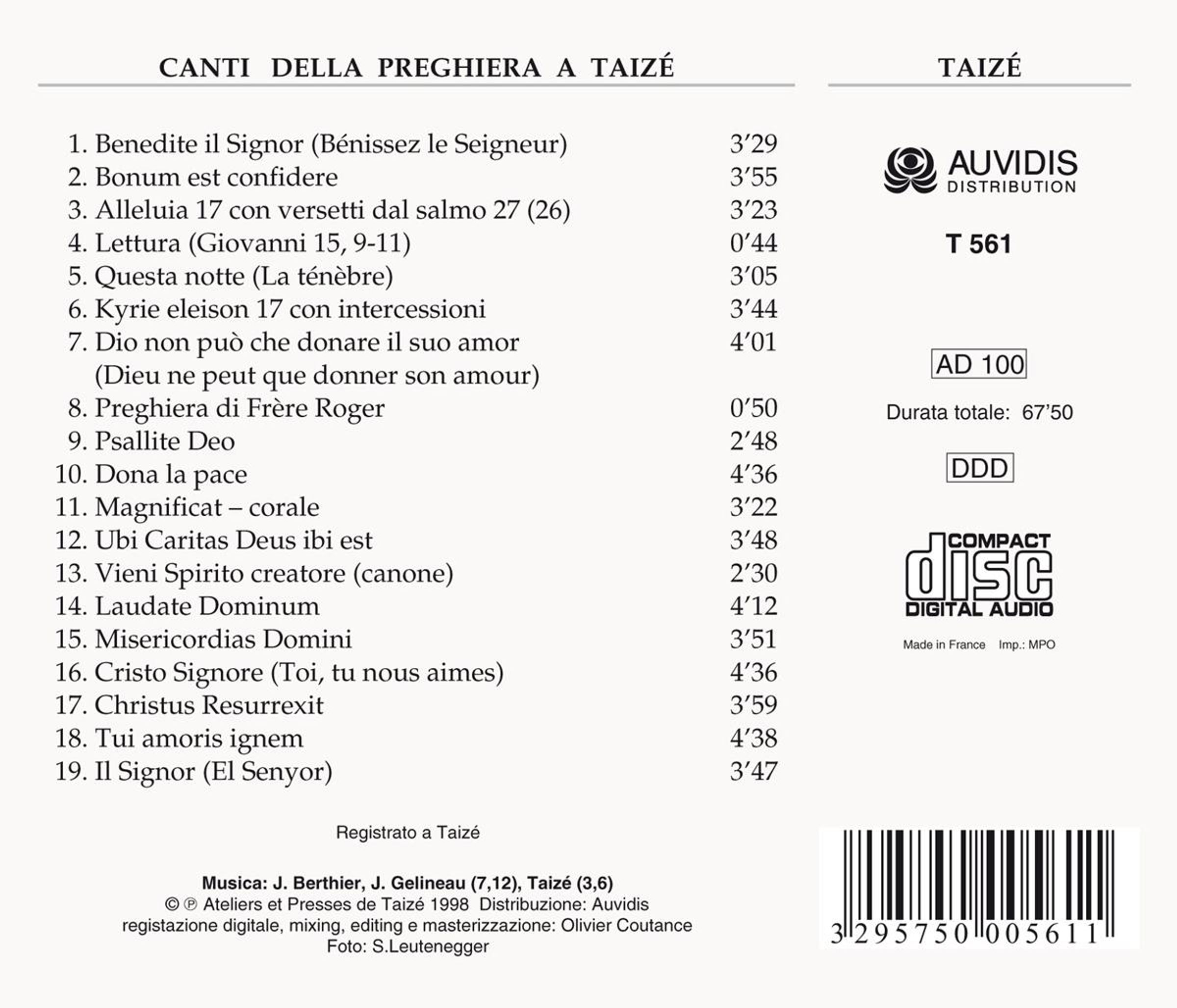 Benedite il Signor; Bonum est confidere; Alleluia 17 con versetti dal salmo 27; Lettura; Questa notte; Kyrie eleison 18 con intercessioni; Dio non puo che donare il suo amor; Preghiera di Frere Roger; Psallite Deo; Dona la pace; Magnificat - corale; ubi Caritas Deus ibi est; Vieni Spirito creatore; Laudate Dominum; Misericordias Domini; Cristo Signore; Christus Resurrexit; Tui amoris ignem; Il Signor
