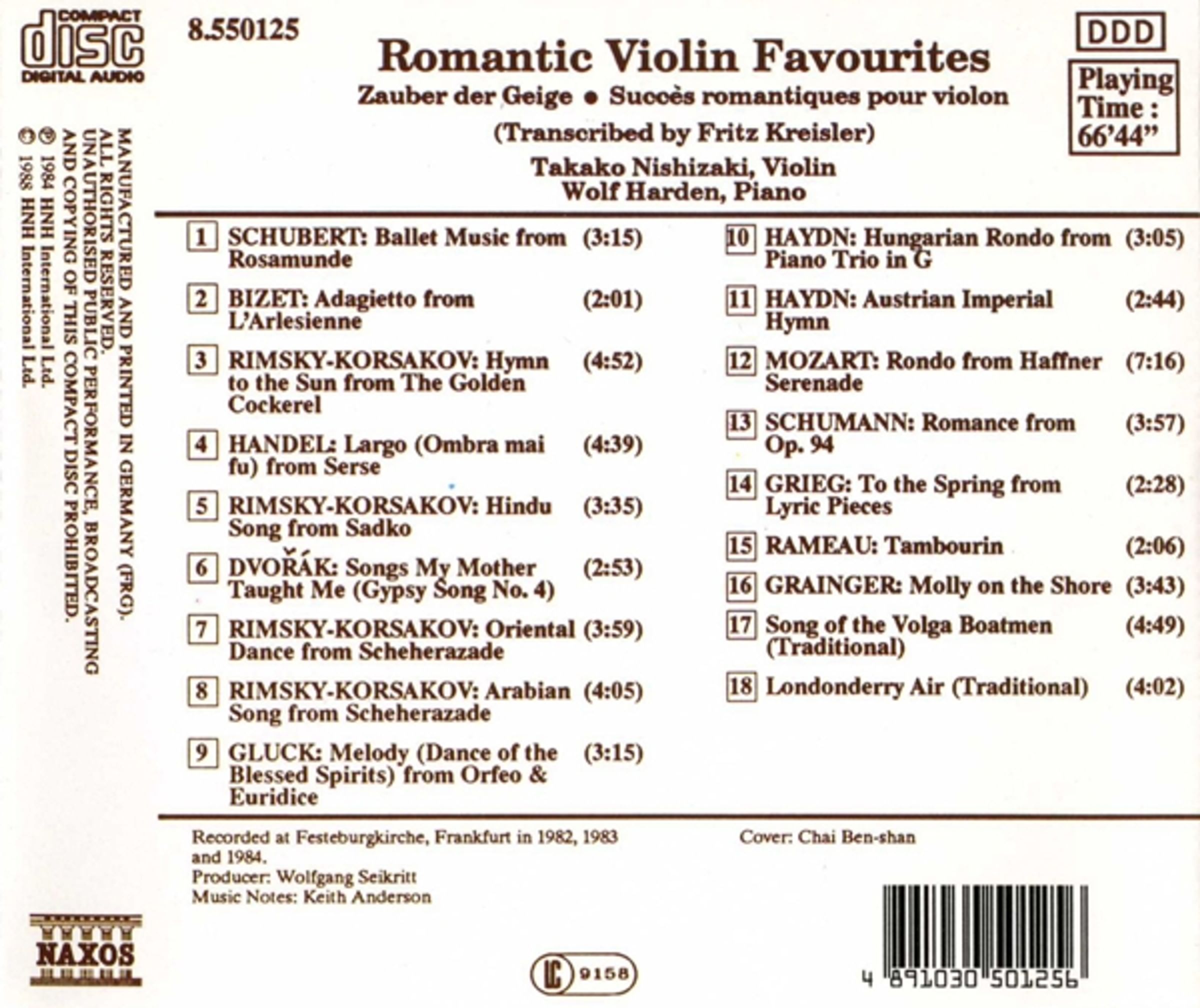 Stücke v. Schubert, Bizet, Rimsky-Korssakoff, Händel, Dvorak, Gluck, Haydn, Mozart, Grieg, Schumann, Rameau, Grainger & 2 Folksongs (allesamt Transkriptionen von Kreisler)