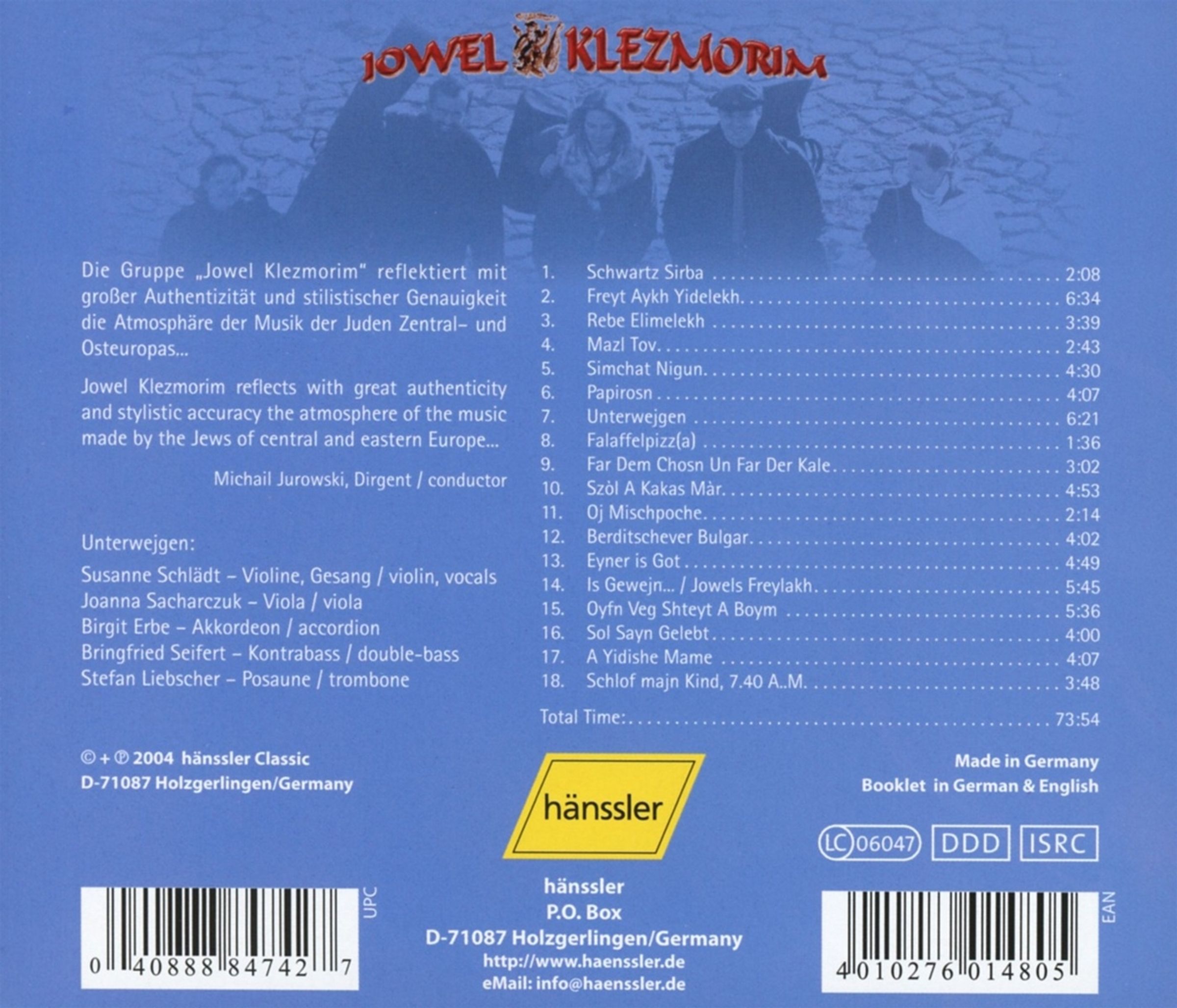 »Unterwejgen« ist die jiddische Bezeichnung für »unterwegs sein«. Unterwegs war die Gruppe »Jowel Klezmorim« im Jahr 2000 in einem Land, das selbst eine sehr bewegte Geschichte hinter sich hat – der Ukraine. Noch heute bezeichnen die fünf Musiker diese Reise als Erfahrung, die sie wohl am meisten geprägt hat. Sie traten dort in Konzertsälen, jüdischen Schulen und Suppenküchen auf. An allen Orten kam es zu sehr bewegenden, tief greifenden Begegnungen, die ihre Spuren auf der vorliegenden CD hinterlassen haben. »Jowel Klezmorim« versucht die Nähe zur klanglichen Tradition der Klezmermusik zu wahren. So werden Tänze sehr traditionell interpretiert und auch die moderneren Arrangements und eigenen Kompositionen arbeiten mit den typischen Stilelementen der osteuropäisch jüdischen Musik. »Unterwegs« sind die Fünf aber auch als Musiker, die allesamt eine klassische Ausbildung erhalten haben und sich in einem Genre bewegen, in dem keiner ursprünglich zu Hause war.
