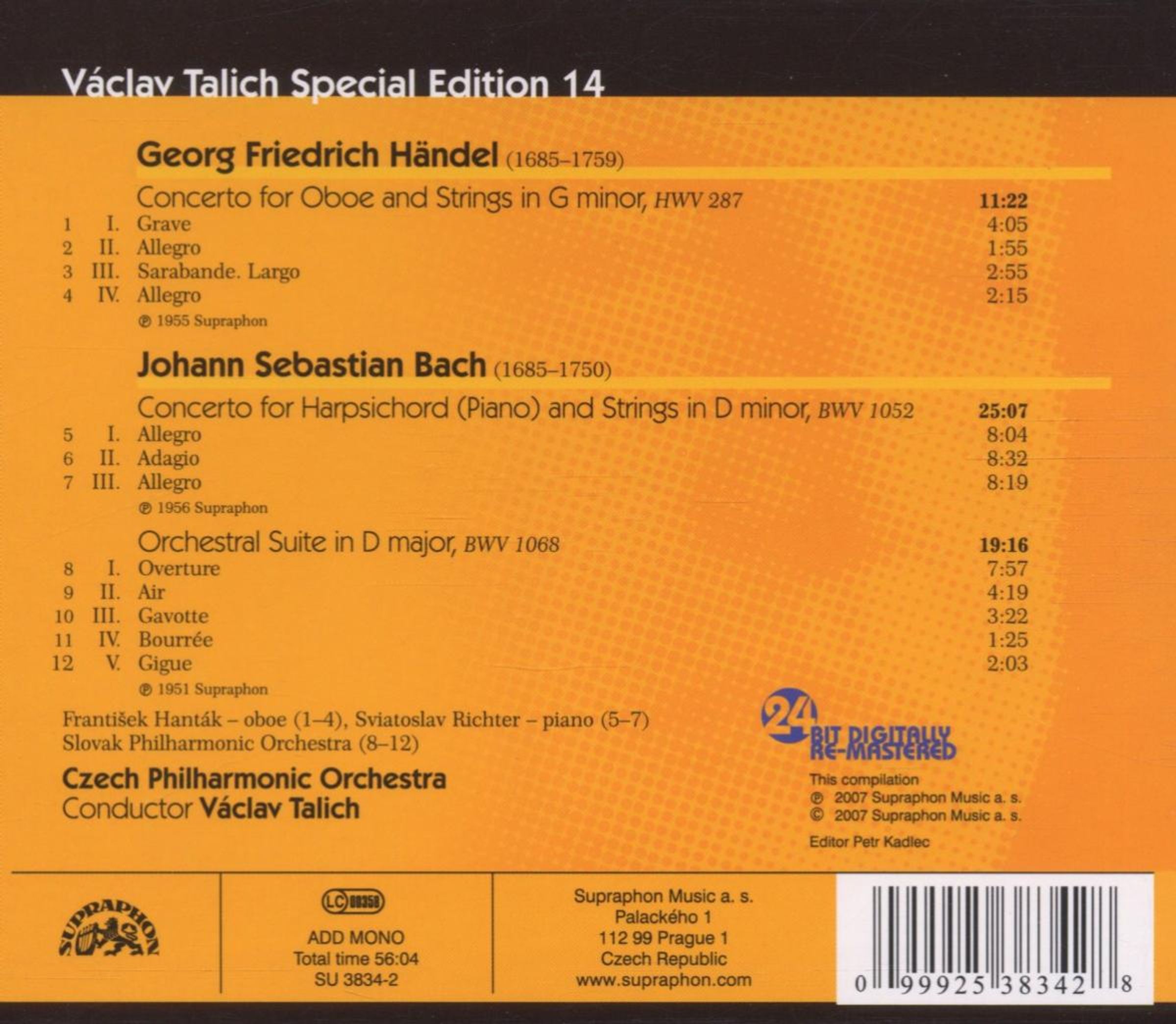 Vaclav Talich and the young Sviatoslav Richter made this now-legendary recording of the Bach piano concerto on the evening before their joint concert in June, 1954. Richter had become the brightest star of that year's Prague Spring festival, the first at which Talich had been able to conduct after many years of being barred from performing by the communists. Bach, (along with Romantic composers and Russian composers) featured prominently in Richter's repertoire, and Talich had also been an avid propagator of Bach's Suite in D Minor in the Czech Republic in the late 1940's. Also on this album: G. F. Händel's oboe concerto, performed by Frantisek Hantak, an outstanding soloist of the Czech Philharmonic.