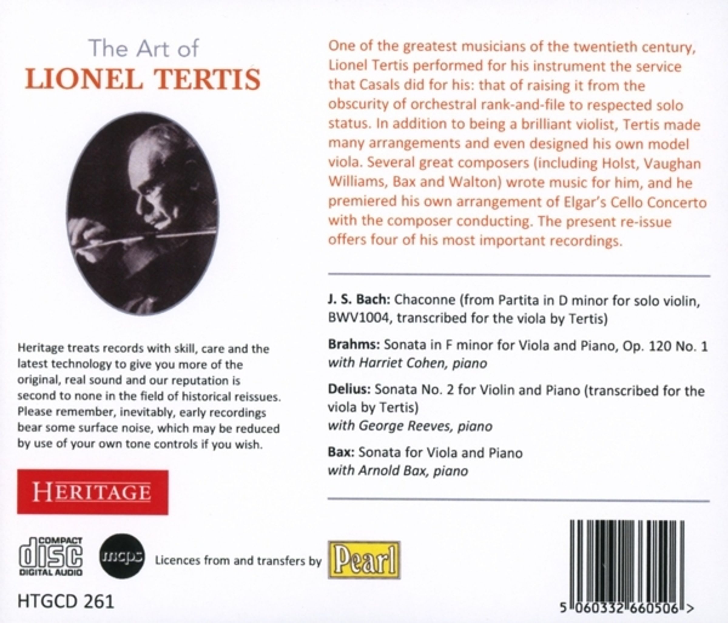 Lionel Tertis leistete seinem Instrument denselben Dienst wie Casals: Er führte es aus der Bedeutungslosigkeit der Orchesterbasis zu einem angesehenen Solokünstler. Die vorliegende Neuauflage bietet vier seiner wichtigsten Aufnahmen, darunter die für Tertis geschriebene Bax-Sonate, begleitet vom Komponisten.