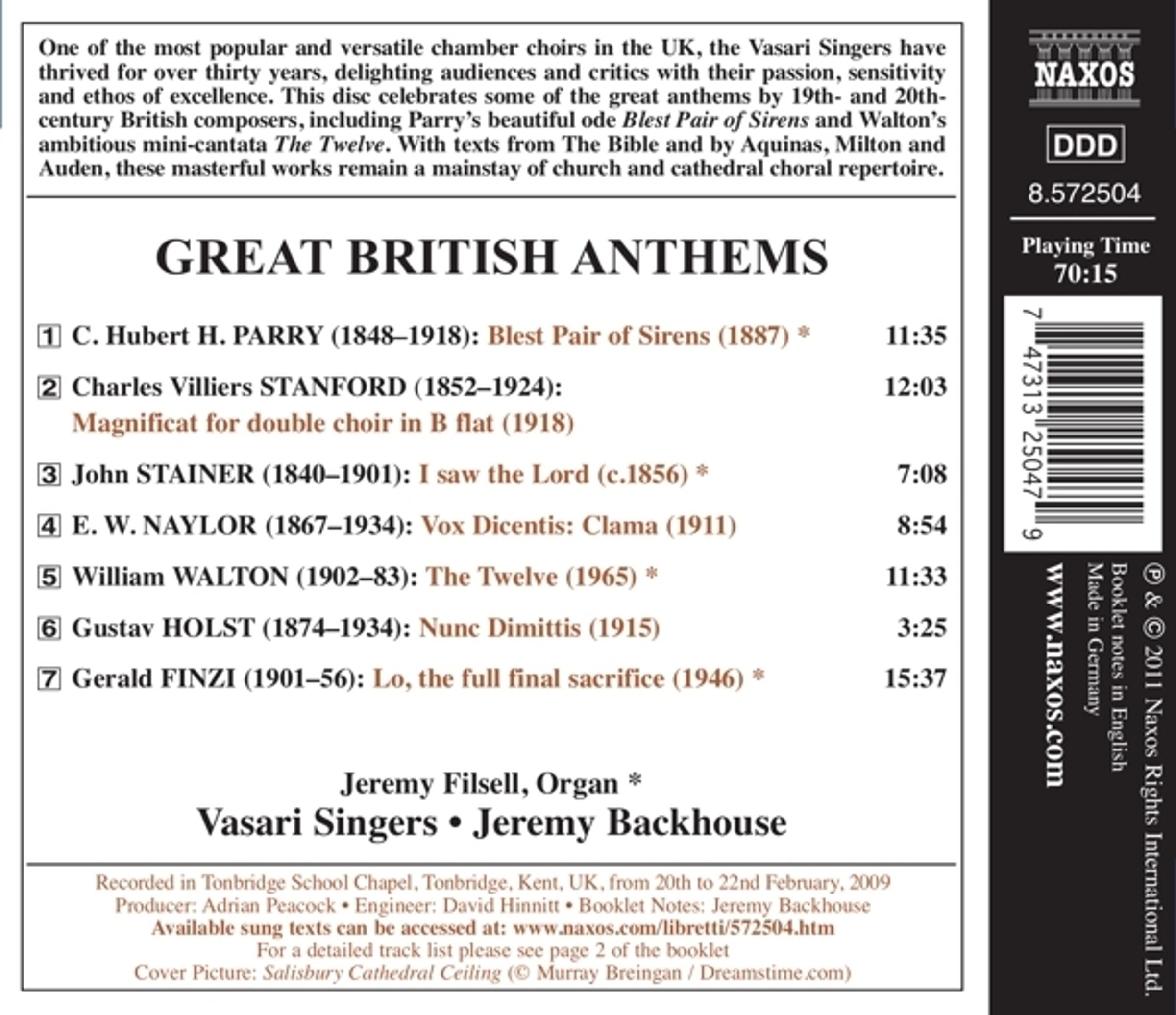 One of the most popular and versatile chamber choirs in the UK, the Vasari Singers have thrived for over thirty years, delighting audiences and critics with their passion, sensitivity and ethos of excellence. This disc celebrates some of the great anthems by 19th- and 20th-century British composers, including Parry's beautiful ode Blest Pair of Sirens and Walton's ambitious mini-cantata The Twelve. With texts from The Bible and by Aquinas, Milton and Auden, these masterful works remain a mainstay of church and cathedral choral repertoire.