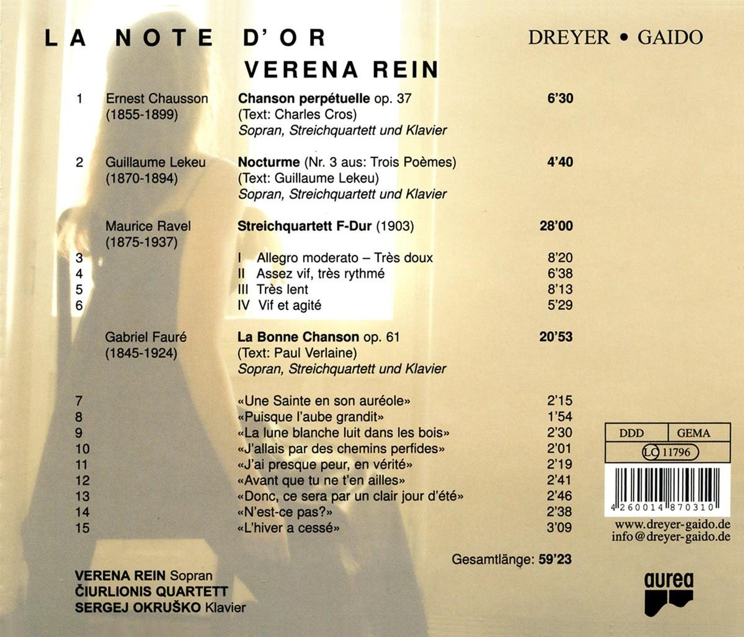 Klassik Heute 12/06: "Die Sopranistin Verena Rein, von dem Pianisten Sergej Okruko und dem Ciurlionis Quartett sensibel sekundiert, gestaltet die Lieder ohne die Distanz und Diskretion, die man von den meisten französischen Interpreten gewohnt ist, vielmehr mit großer Passion und einer Tendenz zum Dramatischen. Das ist stilistisch vielleicht ungewohnt, überzeugt aber durch den künstlerischen Ernst und Nachdruck und - nicht zuletzt - durch die Stimmqualität der Sängerin.... Es ist unmöglich, von dem wahrlich herzerwärmenden Spiel des Ciurlionis Quartetts nicht bezaubert zu werden."Disk 1 von 1 (CD)
