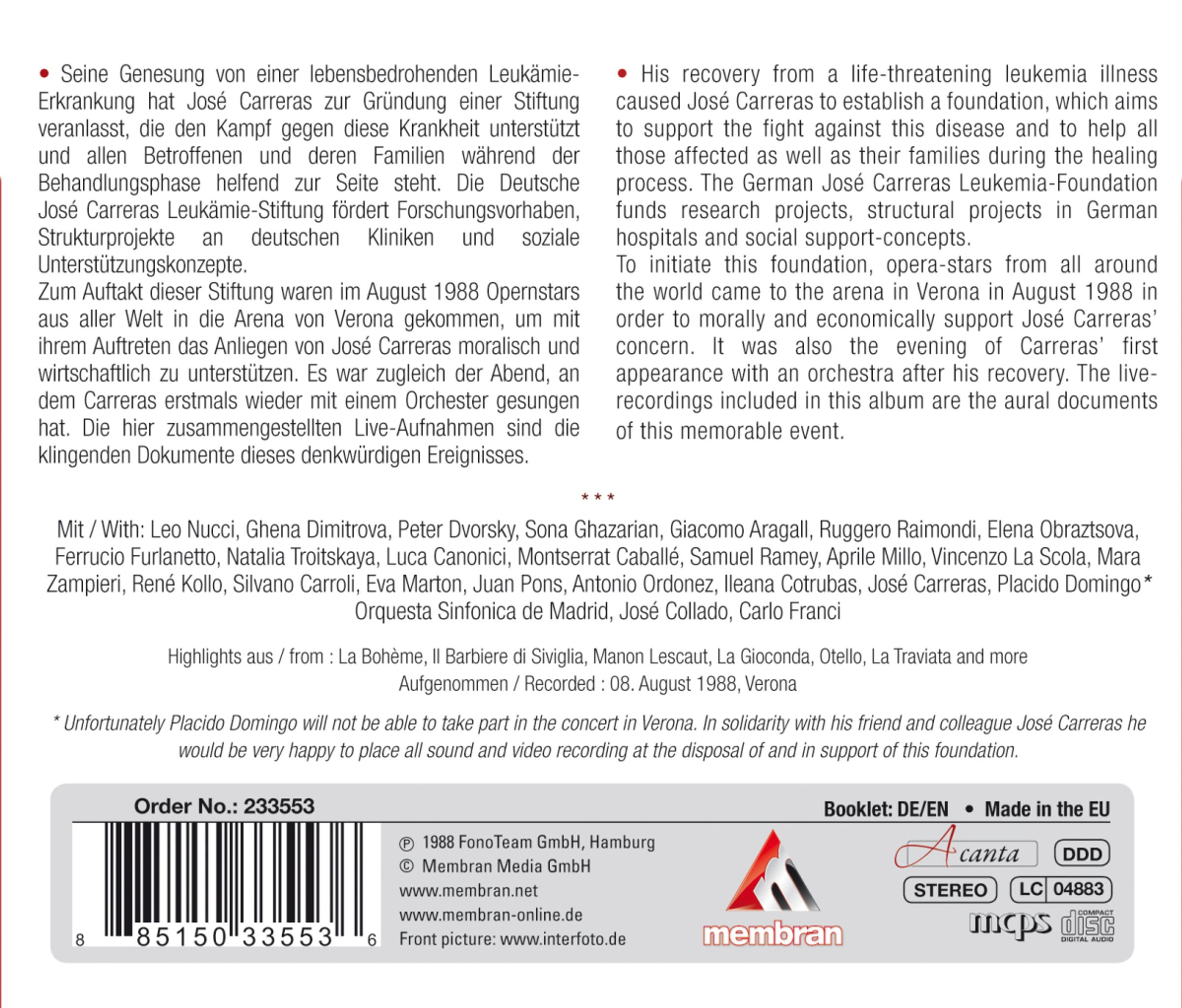 - Leo Nucci, Ghena Dimitrova, Peter Dvorsky, Sona Ghazarian, Giacomo Aragall, Ruggero Raimondi, Elena Obraztsova, Ferruccio Furlanetto, Montserrat Caballe, Samuel Ramey, Aprile Millo, Rene Kollo, Eva Marton, Juan Pons, Ileana Cotrubas, Jose Carreras, Madrid Symphony Orchestra, Jose Collado, Carlo Franci