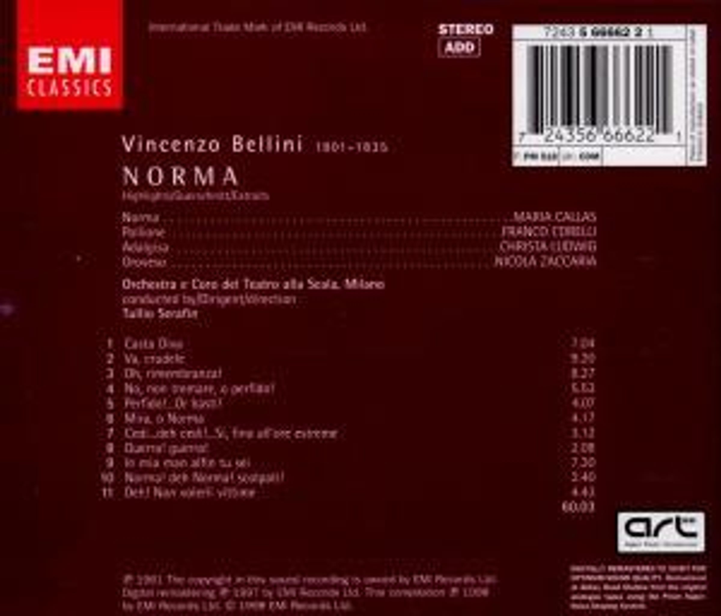 Callas sang Bellinis Norma zum ersten Mal im Jahr 1948, als sie gerade 25 Jahre alt war. Die Rolle der heldenhaften, aber verletzlichen Druidenpriesterin – die ultimative Verkörperung des Belcanto – sang sie in der Folge häufiger als jede andere. In dieser zweiten Studioaufnahme war ihr Dirigent wieder Tullio Serafin (er hatte sie ursprünglich 1948 in der Rolle unterrichtet), und der Veranstaltungsort war wieder die Scala – wo die Oper 1831 uraufgeführt wurde. Bis 1960 brachte Callas eine Fülle neuer Nuancen in ihre Interpretation ein, und sie wird treffend von Christa Ludwig mit ihrem cremigen Mezzosopran (in einer seltenen Aufnahme einer italienischen Rolle) und dem überragenden Franco Corelli begleitet.