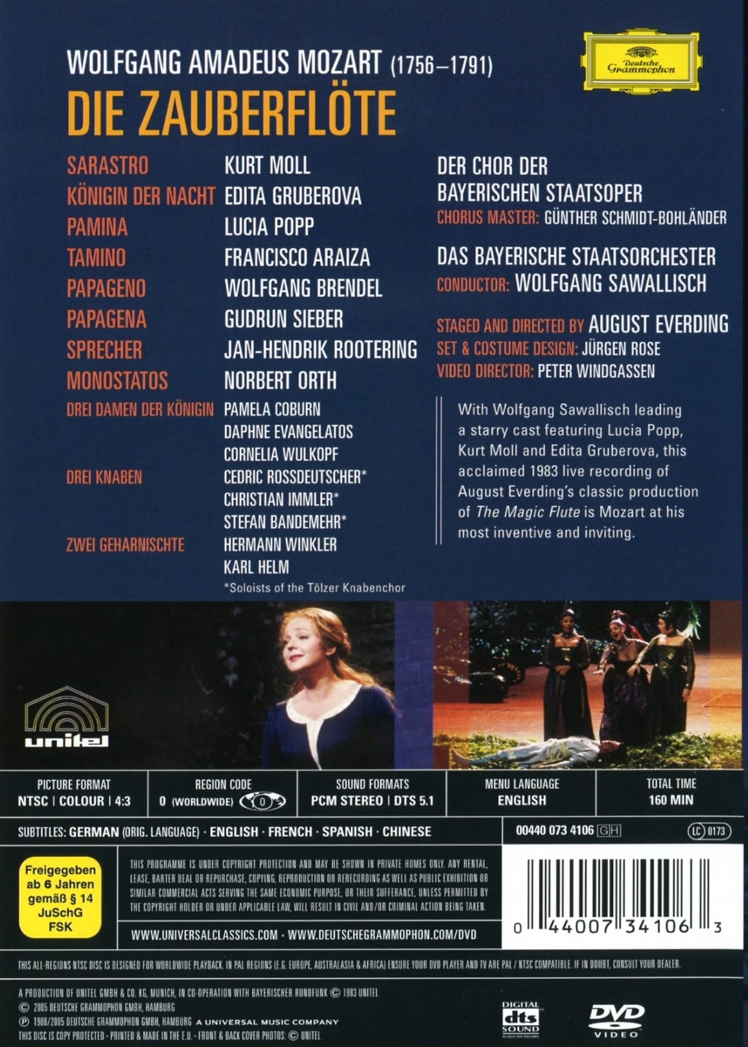Mozarts beliebte Oper "Die Zauberflöte" unter der Leitung von Wolfgang Sawallisch - jetzt erstmals auf DVD erhältlich! 1983 live aufgenommen, zeigt diese Produktion aus der Bayerischen Staatsoper eine der bekanntesten Opern überhaupt - Wolfgang Amadeus Mozarts "Die Zauberflöte" in der Inszenierung von August Everding. Edita Gruberova als begehrteste Königin der Nacht der Welt, Francisco Ariza als einer der berühmtesten Taminos unserer Zeit, machen neben anderen Weltstars der Oper (Kurt Moll, Lucia Popp, Wolfgang Brendel, u. a.) diese Produktion zu einem Fest für Augen und Ohren. Eingerahmt und kongenial geleitet wird dieses Ensemble von Wolfgang Sawallisch. "Zeigt das Ernsthafte - vergesst aber den Humor nicht" - mit dieser Einstellung beweist Everding in dieser einzigartigen Inszenierung sein Genie auf dem Gebiet der Opernregie. Diese Zauberflöte ist ein absolutes Muss für alle Opernfans.