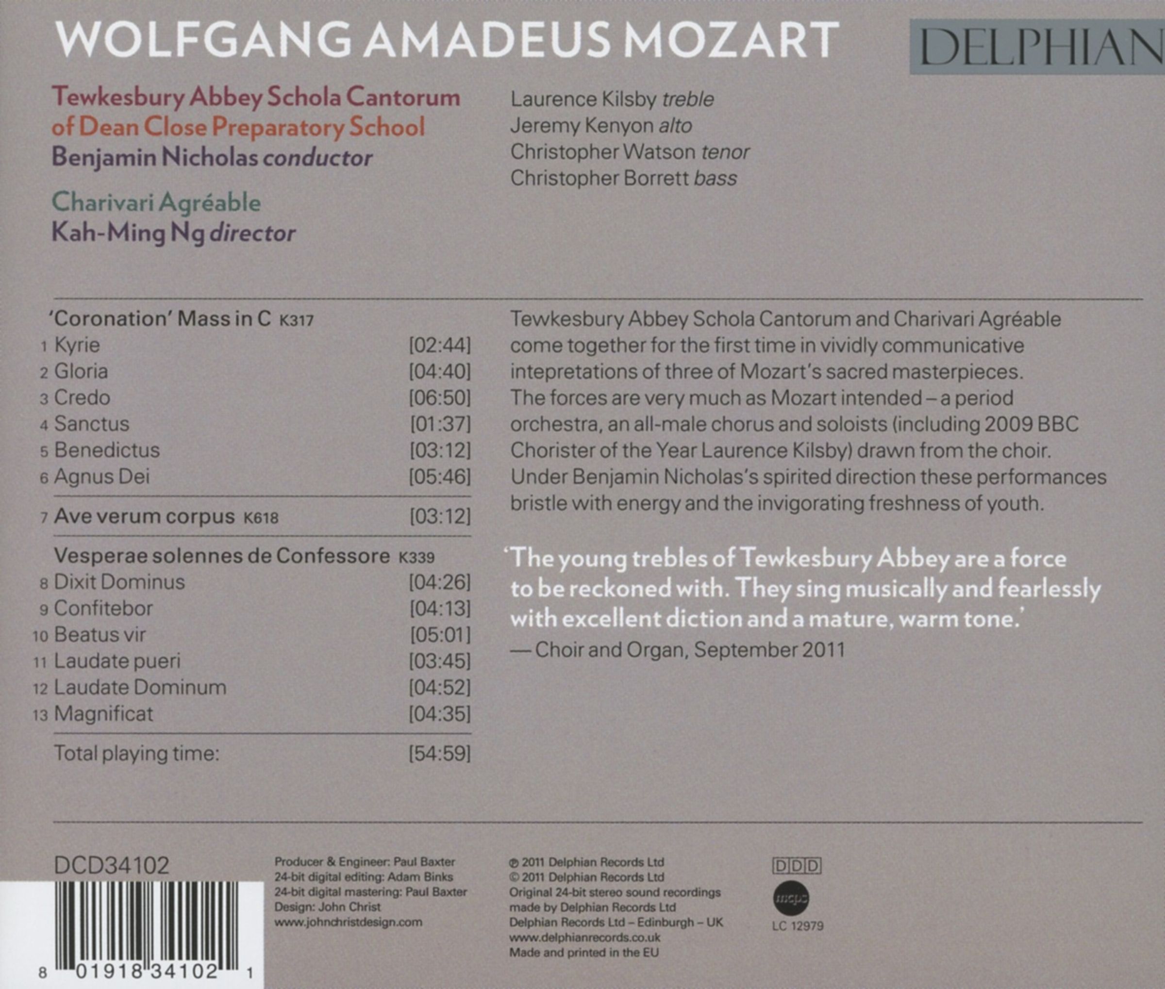 - Laurence Kilsby, Jeremy Kenyon, Christopher Watson, Christopher Borrett, Tewkesbury Abbey Schola Cantorum of Dean Close Preparatory School, Charivari Agreable, Benjamin Nicholas, Kah-Ming Ng