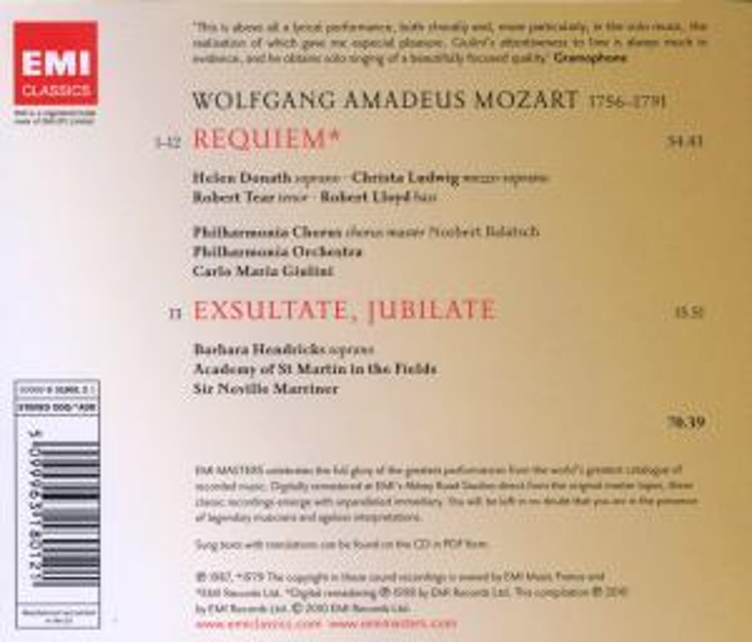 - Helen Donath, Christa Ludwig, Robert Tear, Robert Lloyd, Philharmonia Orchestra, Carlo Maria Giulini (KV 626); Barbara Hendricks, Academy of St. Martin in the Fields, Neville Marriner