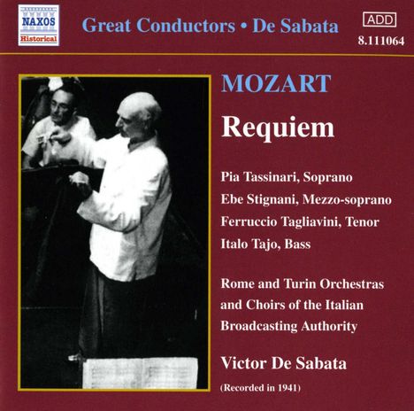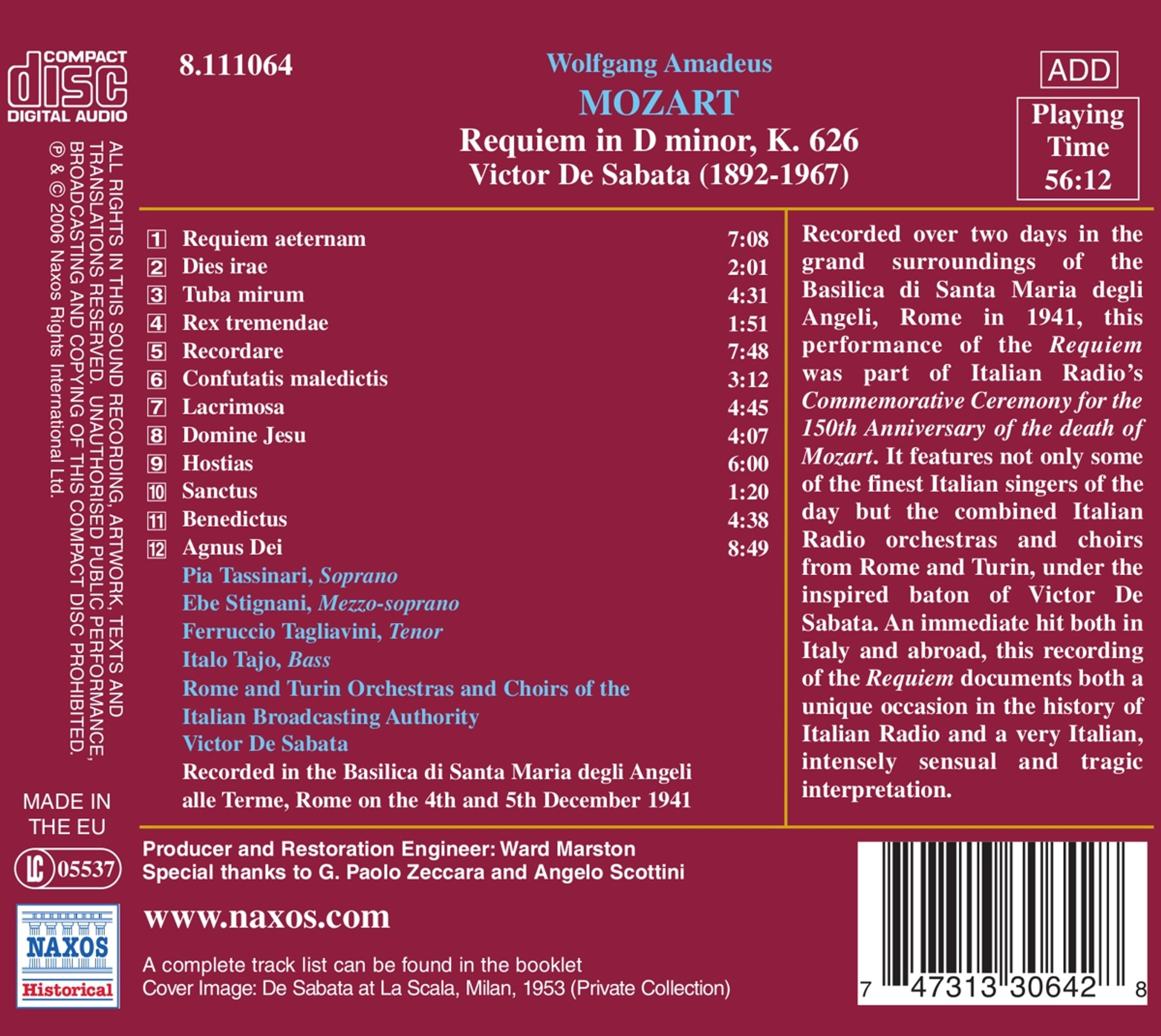 Recorded over two days in the grand surroundings of the Basilica di Santa Maria degli Angeli, Rome in 1941, this performance of the Requiem was part of Italian Radio's Commemorative Ceremony for the 150th Anniversary of the death of Mozart. It features not only some of the finest Italian singers of the day but the combined Italian Radio orchestras and choirs from Rome and Turin, under the inspired baton of Victor De Sabata. An immediate hit both in Italy and abroad, this recording of the Requiem documents both a unique occasion in the history of Italian Radio and a very Italian, intensely sensual and tragic interpretation.