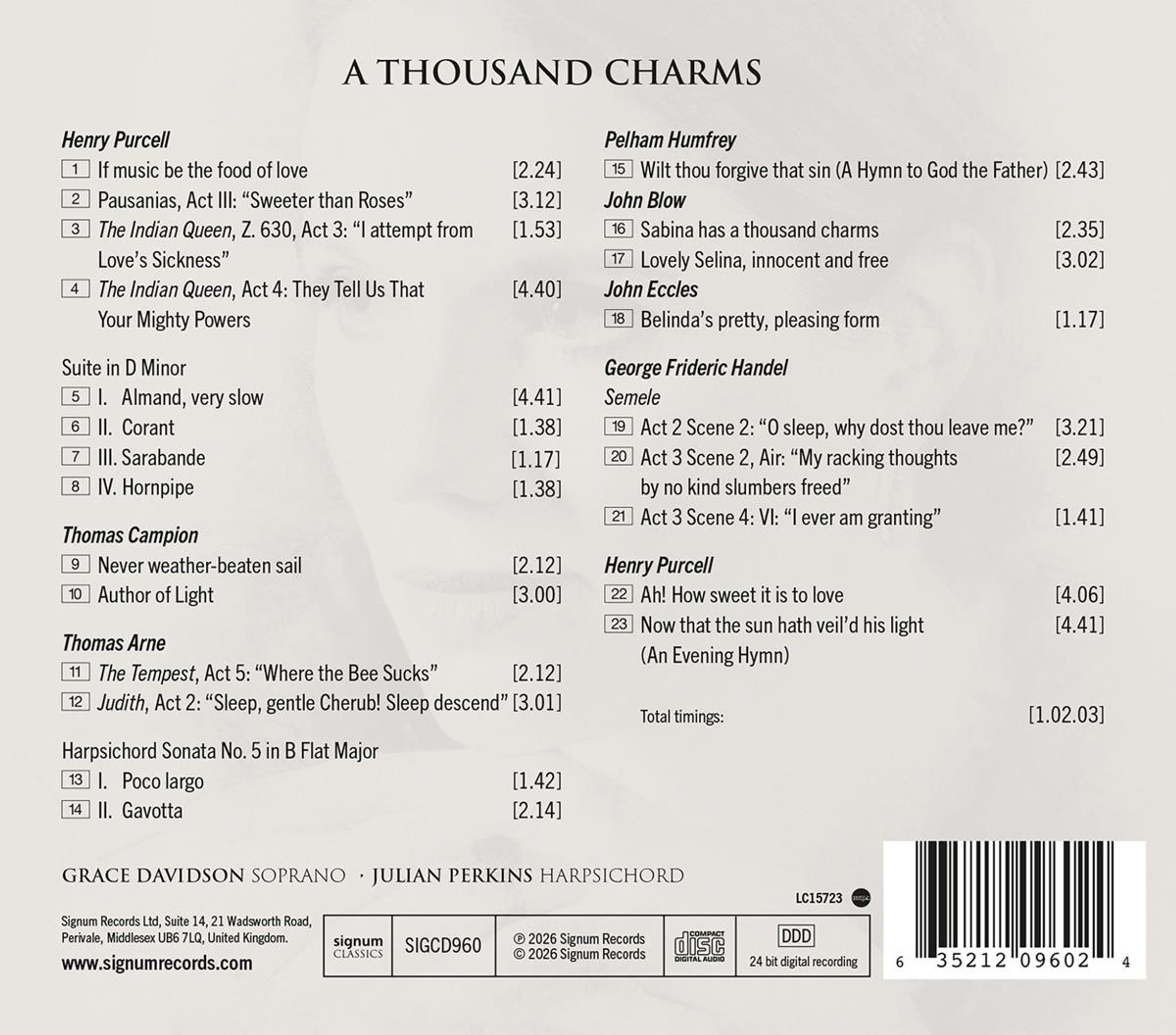 A Thousand Charms entführt die Zuhörer in zwei Jahrhunderte englischer Liedkunst, von Campions intimen Ayres über Purcells theatralische Meisterwerke bis hin zu Händels ausdrucksstarken Arien. Das Programm zeichnet nach, wie sich das Sololied von der von der Laute inspirierten Schlichtheit zu einem reich verzierten Drama entwickelte, das Poesie mit Musik von beeindruckender Klarheit und Tiefe verbindet. Grace Davidsons reine, agile Stimme und Julian Perkins' einfühlsame Cembalo-Begleitung verleihen diesem Repertoire Frische und Unmittelbarkeit und betonen seine Raffinesse, Kreativität und Menschlichkeit. Für alle, die sich von der Schönheit der Alten Musik angezogen fühlen, bietet diese Aufnahme eine fesselnde Reise durch einige ihrer zeitlosesten Werke.