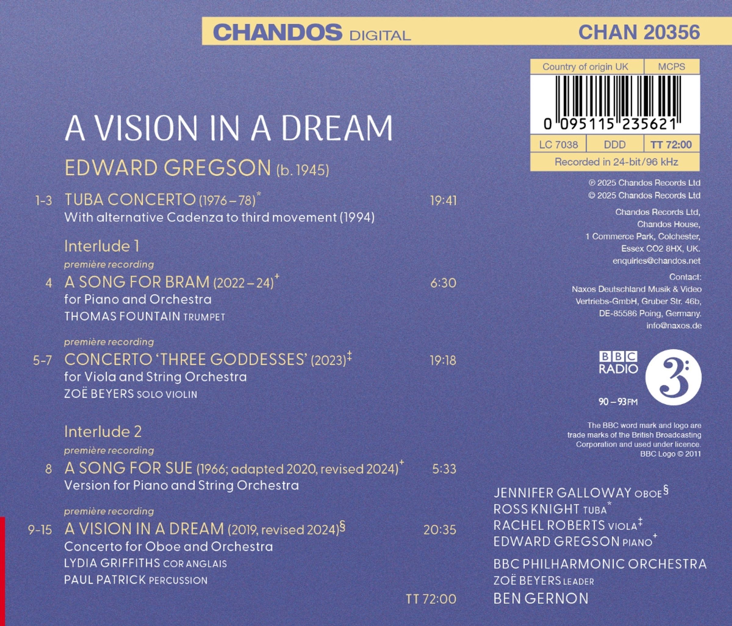 Edward Gregson, ein preisgekrönter englischer Komponist von internationalem Rang und einer der führenden Komponisten seiner Generation, dessen Musik in vielen Ländern aufgeführt, aufgenommen und ausgestrahlt wurde, feiert 2025 seinen achtzigsten Geburtstag. Er komponiert und tritt nach wie vor aktiv auf. Dieses Album präsentiert drei große Konzerte, unterbrochen von zwei kürzeren Werken fur Klavier und Orchester. "A Song for Bram" wurde in Erinnerung an seinen großen Freund und Förderer, den Dirigenten Bramwell Tovey, geschrieben. "A Song for Sue", eine Überarbeitung des zentralen Nocturnes aus seinem "Concertante für Klavier und Blasorchester" (1966), ist eine Hommage an seine Frau aus dem Jahr 2024. Eines seiner meistgespielten Werke, das "Tuba Concerto", wurde für John Fletcher geschrieben, der es 1977 uraufführte. Gregsons Konzert fur Viola und Streichorchester "Three Goddesses" wurde 2023 von Rachel Roberts uraufgeführt. Die in den drei Sätzen dargestellten Göttinnen sind Morrigan (keltische Kriegerkönigin und Erdmutter), Aphrodite (griechische Göttin der Liebe und Schönheit) und Diana (römische Göttin der Jagd). Das Oboenkonzert "A Vision in a Dream", das 2020 von den hier zu hörenden Musikern in Leeds uraufgeführt wurde, ist von Samuel Taylor Coleridges Gedicht "Kubla Khan" inspiriert. Gregson folgt der Erzählung und kommt damit - mehr als bei allen anderen Konzerten - der sinfonischen Dichtung am nächsten. Die Werke werden vom BBC Philharmonic Orchestra unter Ben Gernon gespielt. Edward Gregson selbst übernimmt das Klavier, weitere Solisten sind Jennifer Galloway (Oboe), Ross Knight (Tuba) und Rachel Roberts (Viola).