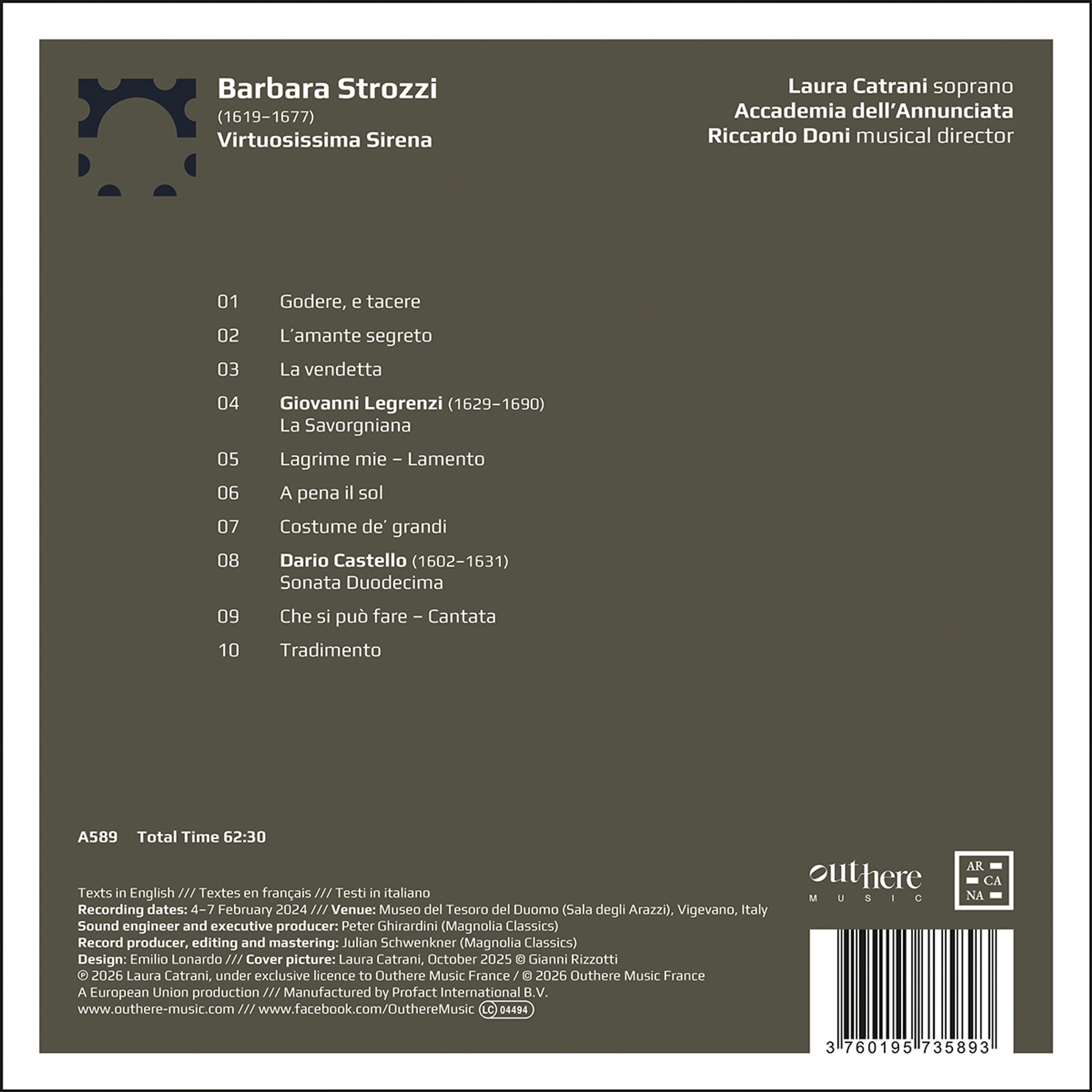 Barbara Strozzi, eine venezianische Sängerin und Komponistin, die zwischen 1619 und 1677 lebte, ist ein seltenes Juwel in der Musiklandschaft des italienischen Seicento. Als Adoptivtochter (und möglicherweise leibliche Tochter) von Giulio Strozzi, einem Literaten aus der berühmten Florentiner Familie, lehnte sie die alternativen Perspektiven einer Heirat oder eines Lebens im Kloster ab, um sich ganz ihrer einzigen wahren Leidenschaft zu widmen: der Musik. Darüber hinaus wollte sie sich nicht nur als Interpretin, sondern auch als Komponistin behaupten und überschritt damit die strengen Regeln der damaligen Zeit. Im Laufe von zwanzig Jahren veröffentlichte sie über 120 Kantaten und andere Werke für Solostimme, eine Zahl, die von keinem ihrer Zeitgenossen erreicht wurde. In ihren bedeutendsten Werken verbindet sie die absolute Originalität ihrer formalen Strukturen mit einer außergewöhnlich intensiven und überschwänglichen Poetik der »Affekte«. In dieser Hinsicht ist ihre Vokalmusik nur mit der des größten italienischen Komponisten des Jahrhunderts, Claudio Monteverdi, vergleichbar.