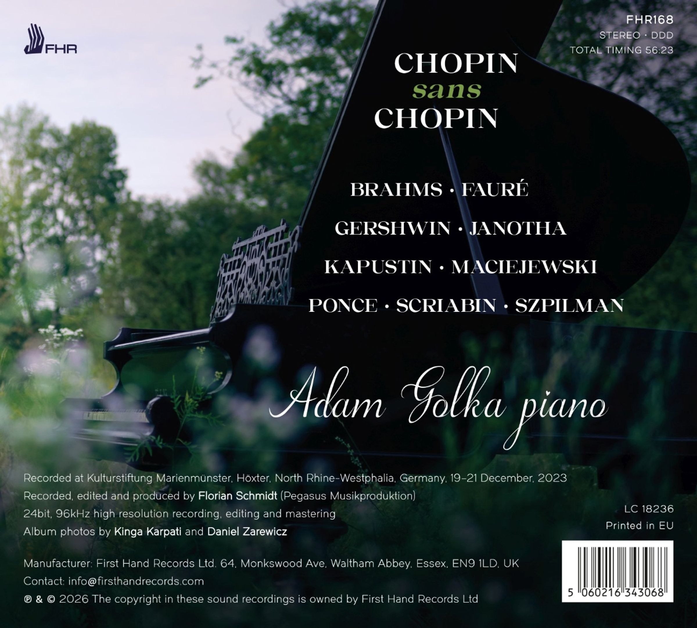 "Chopin sans Chopin" ist Adam Golkas sehr personliche Hommage an Frederic Chopin, mit Werken, die von Chopin inspiriert sind, anstatt Musik des Meisters selbst zu spielen. Das Album enthalt eine Vielzahl internationaler Komponisten des 19. und 20. Jahrhunderts: Gabriel Faure, Johannes Brahms, Natalia Janotha, Alexander Scriabin, Roman Maciejewski, Manuel Ponce, George Gershwin, Wladyslaw Szpilman, Nikolai Kapustin, darunter sind auch solche