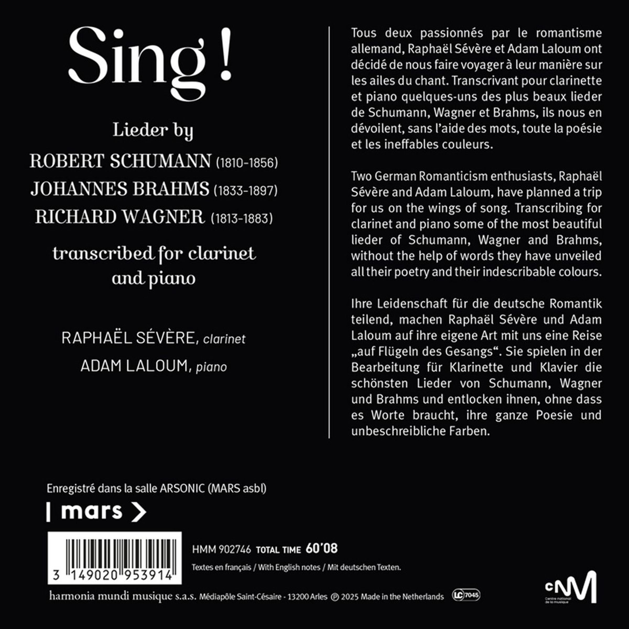 Ihre Leidenschaft für die deutsche Romantik teilend, machen Raphaël Sévère und Adam Laloum auf ihre eigene Art eine Reise „auf Flügeln des Gesangs“. Sie spielen in der Bearbeitung für Klarinette und Klavier die schönsten Lieder von Schumann, Wagner und Brahms und entlocken ihnen, ohne dass es Worte braucht, ihre ganze Poesie und unbeschreibliche Farben.
