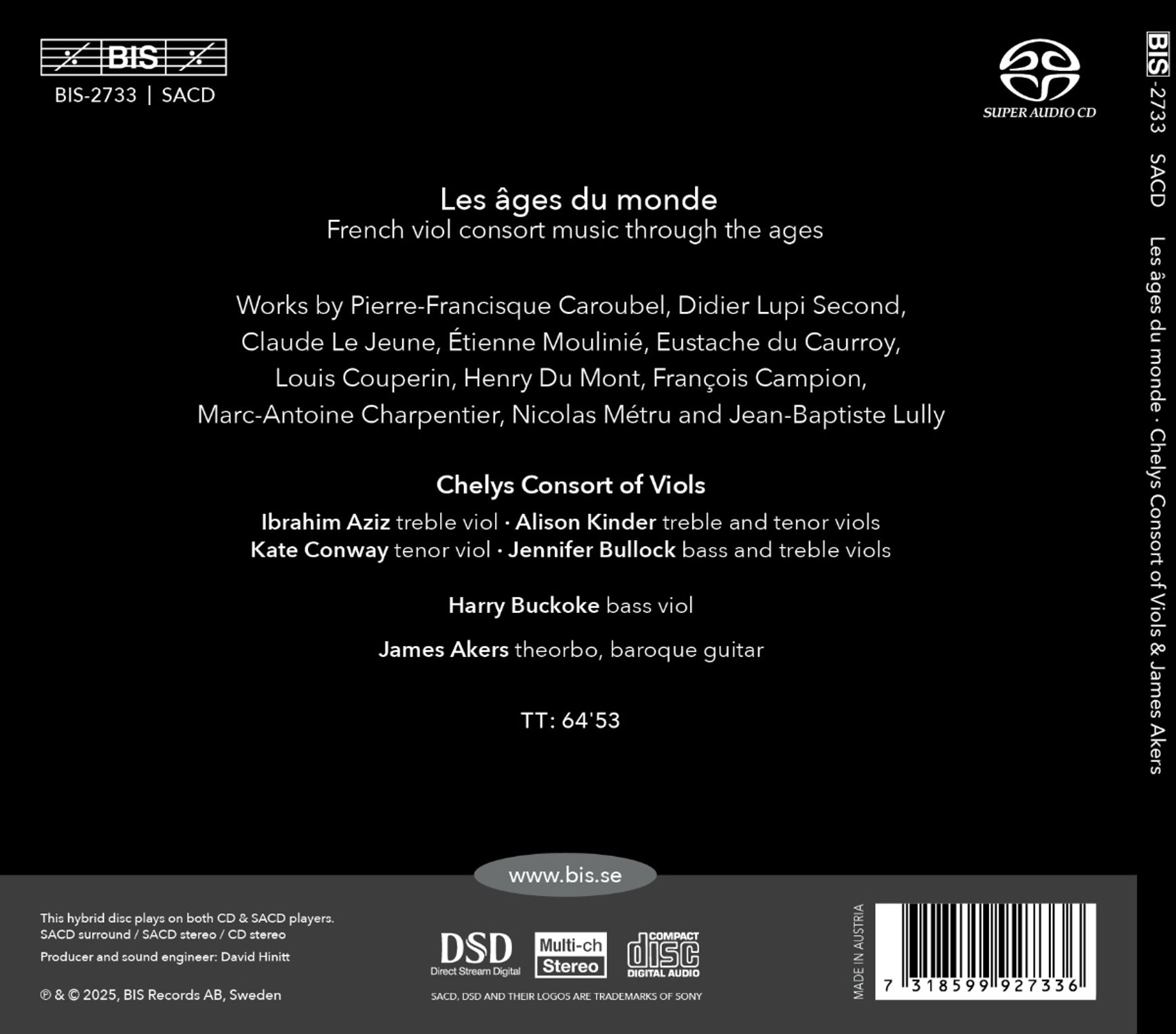 Nach vielbeachteten Aufnahmen mit englischer Musik für Gambenensemble, insbesondere denen von Christopher Simpson, Henry Purcell und William Byrd (BIS2663), präsentiert das Chelys Consort nun ein Programm, das sich mit der Musik befasst, die im Frankreich des 16. und 17. Jahrhunderts gespielt worden sein könnte. Die hier vorgestellten Werke umfassen Bearbeitungen und Fantasien zu populären Liedern, Tänzen und einer Suite und demonstrieren die extreme Vielseitigkeit der Viola da Gamba, die sich allein oder in einer Gruppe an alle Musikgenres anpassen konnte. Obwohl die Blütezeit dieses Instruments in Frankreich zwischen der Mitte des 17. und der Mitte des 18. Jahrhunderts lag – hier vertreten durch Werke von Charpentier, Metru und Lully - das Programm räumt auch früheren Kompositionen einen hohen Stellenwert ein, darunter Tänze und Fantasien von Caroubel, Le Jeune, Moulinie, Du Caurroy, Louis Couperin und Du Mont. Schließlich umfasst das Programm auch drei Stücke für Sologitarre von Francois Campion, die vom Gastmusiker James Akers gespielt werden. Diese Stücke erinnern daran, dass die Barockgitarre, die bereits in Gemälden von Vermeer und Watteau zu sehen ist, die Laute als das am weitesten verbreitete häusliche Musikinstrument ablösen sollte. Ein Programm, das Eleganz, raffinierte Melancholie, schönen Klang und einen subtilen Dialog zwischen den verschiedenen Instrumenten in den Vordergrund stellt.