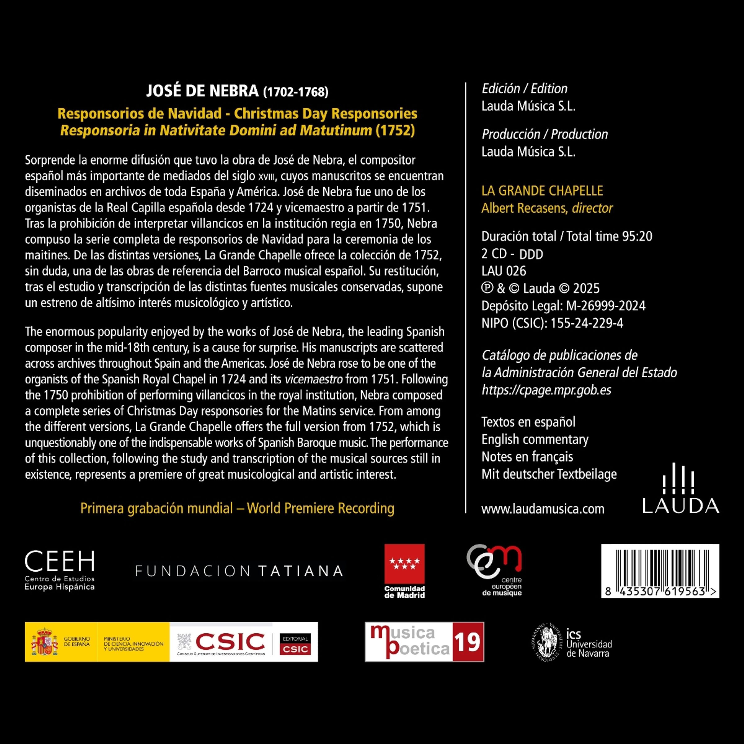 Die enorme Popularität der Werke von José de Nebra, dem führenden spanischen Komponisten der Mitte des 18. Jahrhunderts, ist überraschend. Seine Manuskripte sind über Archive in ganz Spanien und Amerika verstreut. José de Nebra stieg 1724 zum Organisten der spanischen Königskapelle auf und wurde 1751 deren Vizemaestro. Nach dem Verbot der Aufführung von Villancicos in der königlichen Institution im Jahr 1750 komponierte Nebra eine komplette Reihe von Responsorien für den Weihnachtsgottesdienst. Aus den verschiedenen Versionen bietet La Grande Chapelle die vollständige Fassung von 1752, die zweifellos zu den unverzichtbaren Werken der spanischen Barockmusik gehört. Die Aufführung dieser Sammlung, die auf der Untersuchung und Transkription der noch erhaltenen Musikquellen basiert, stellt eine Premiere von großem musikwissenschaftlichem und künstlerischem Interesse dar.
