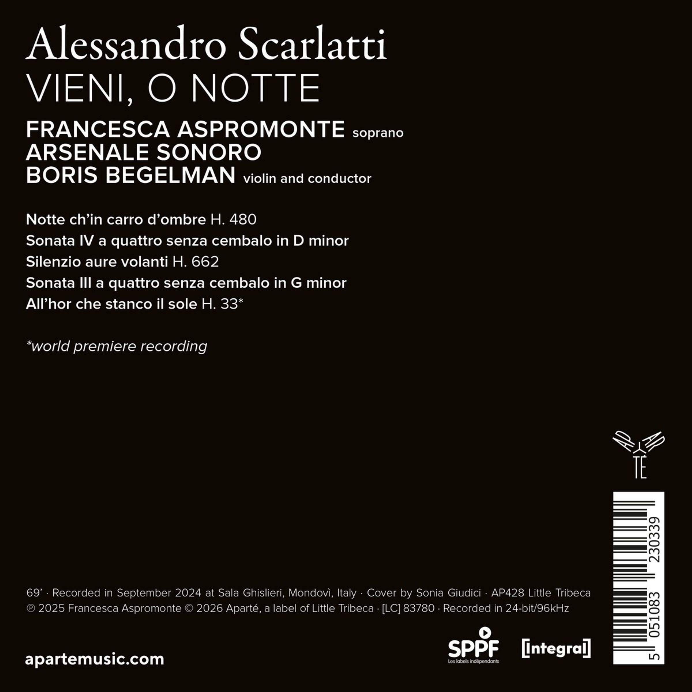 Mit „Vieni, o Notte“ – Werken ausschließlich von Alessandro Scarlatti – legt die Sopranistin Francesca Aspromonte ihr erstes Album bei Aparté vor. Zusammen mit Arsenale Sonoro und Boris Begelman erkundet sie drei Kantaten (hier auch als Serenaden bezeichnet), in denen der Komponist die Nacht zur Bühne für die vereitelten Lieben seiner Figuren macht. Er gibt ihnen Arien und Rezitative, die schmerzhaft, kontemplativ oder brennend sind. Erstmals aufgenommen wurde „All’hor che stanco il sole“, eine musikalische Meditation über Liebe und Verlust. Die Barock-Spezialistin Aspromonte offenbart meisterhaft die ganze Sinnlichkeit dieser Musik.
