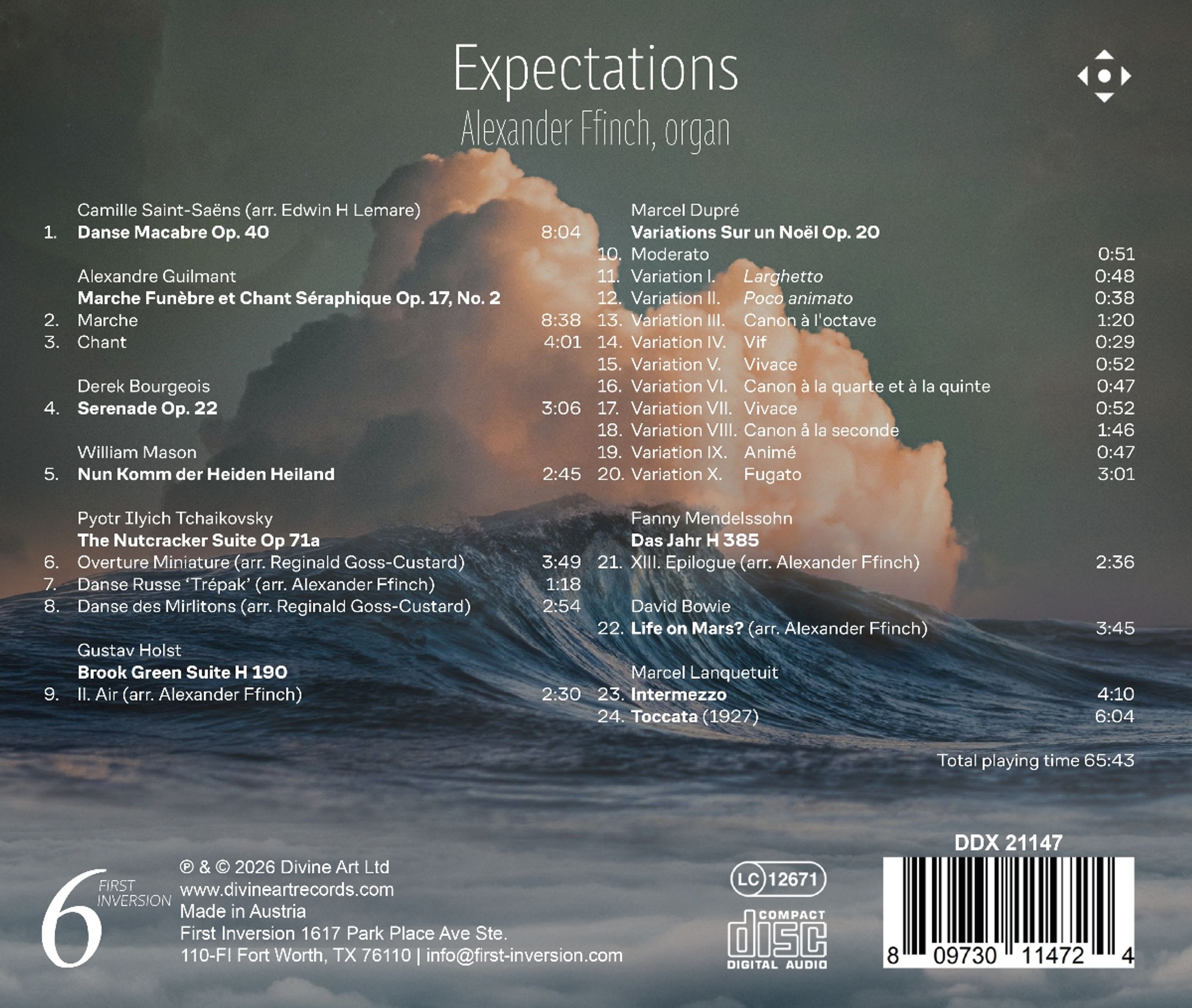 "Epilog" aus Fanny Mendelssohns "Das Jahr" ist eine eindringliche und doch optimistische Darstellung des Mitternachtsschlags an Silvester. Zwei Werke des Meisterorganisten Marcel Lanquetuit, "Toccata" und sein weniger bekanntes "Intermezzo" folgen. Ffinch stellt die Frage nach Erwartungen mit David Bowies eindringlichem Song "Life on Mars?", an dessen 10. Todestag. Alexander Ffinch hat sich als renommierter Organist mit Auftritten in
