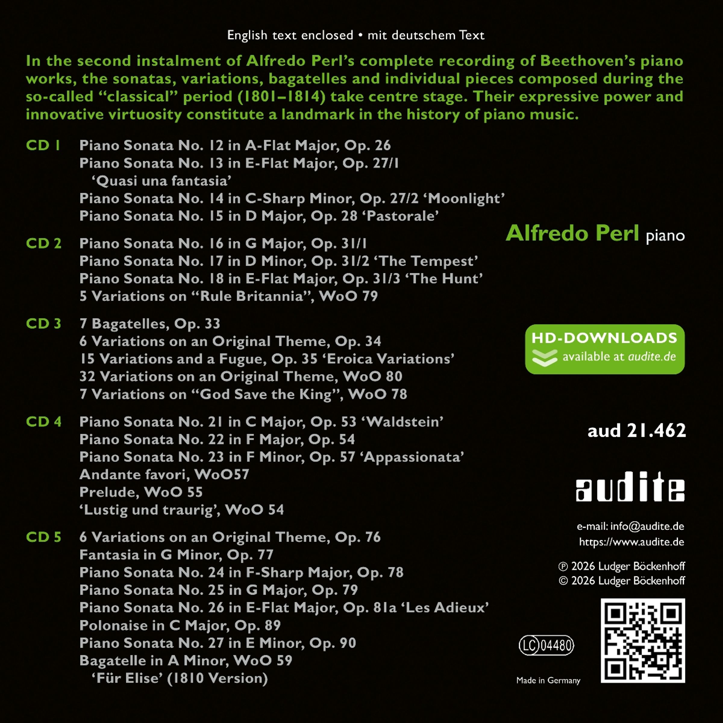 Nach dem international gefeierten ersten Teil von Alfredo Perls dreiteiliger Gesamteinspielung der Klaviermusik Ludwig van Beethovens umspannt die zweite Box den Zeitraum der Jahre 1801-1814. Schon fruh sprach die Literatur hier von einer 'mittleren' oder 'klassischen' Schaffensphase: Dies verstellt jedoch den Blick auf ein kompositorisches Denken, das wesentlich durch den Ruckgriff auf Fruheres und den Vorgriff auf Kommendes sowie die