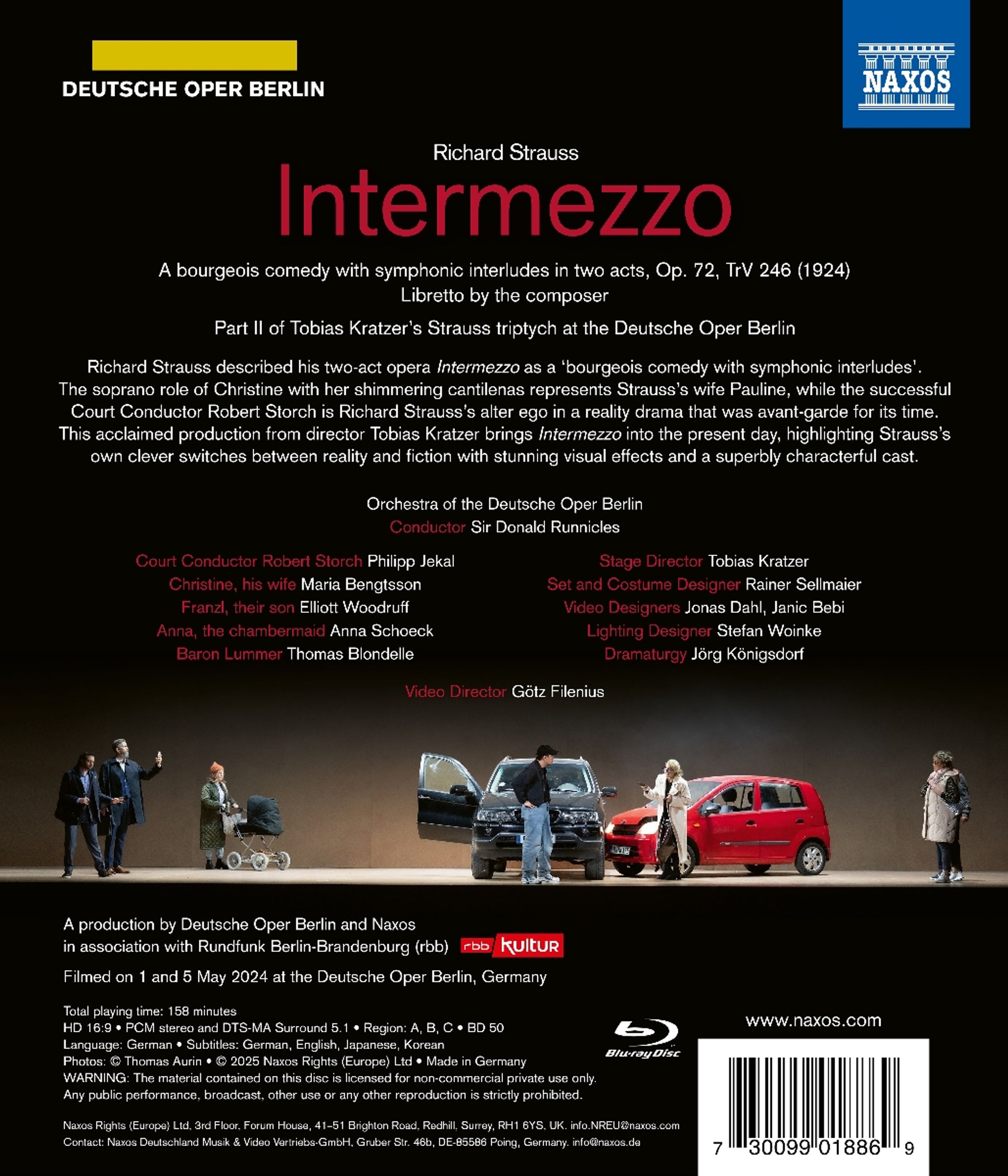 "Intermezzo" in die Gegenwart und unterstreicht Strauss' geschickte Wechsel zwischen Realitat und Fiktion mit atemberaubenden visuellen Effekten und einer hervorragenden, charakterstarken Besetzung. Sir Donald Runnicles dirigiert das Orchester der Deutschen Oper Berlin. Die ausgezeichnete Besetzung umfasst die Sopranistin Maria Bengtsson, den Tenor Thomas Blondelle und den Bariton Philipp Jekal. Dies ist der zweite Teil von Tobias Kratzers