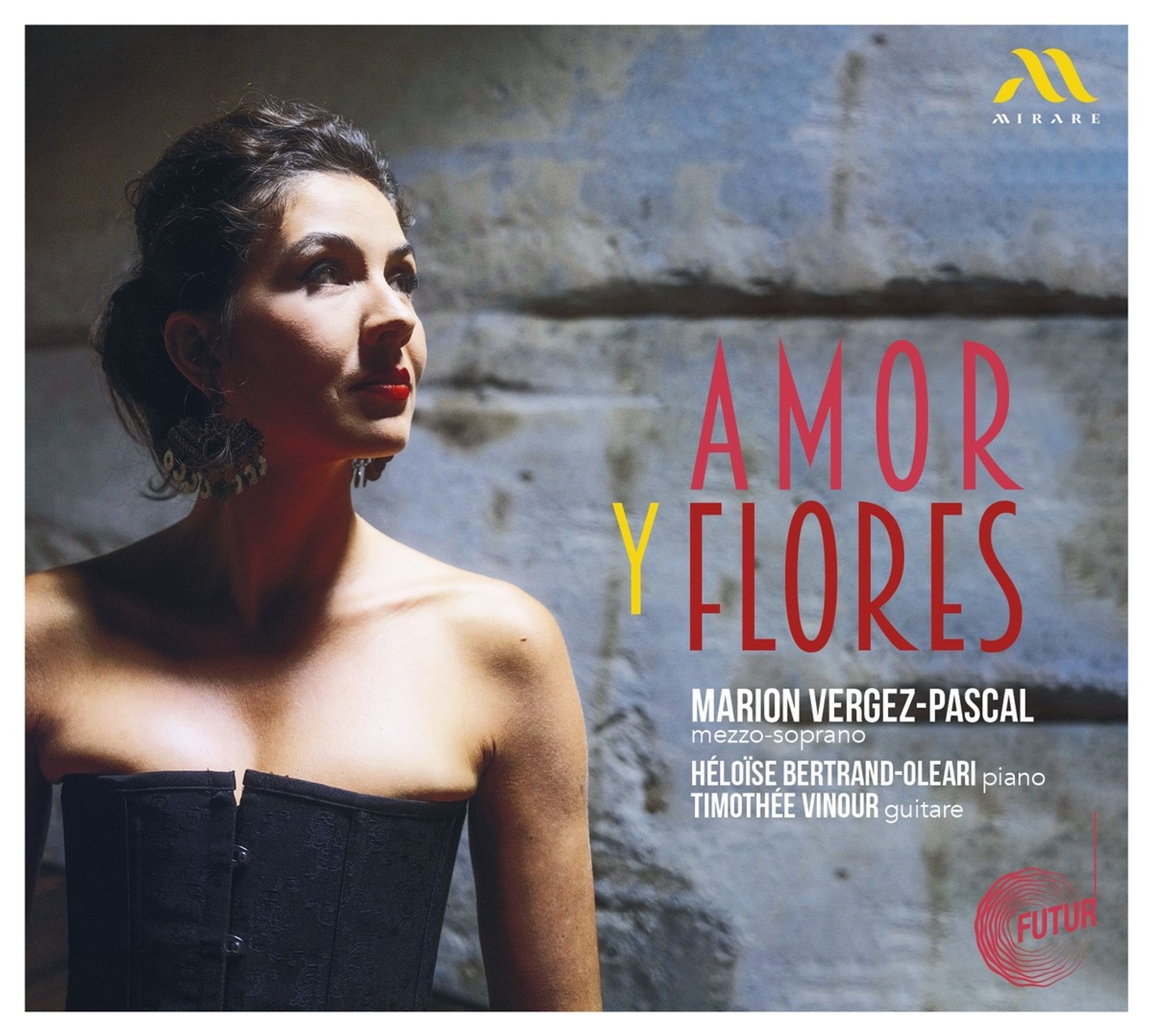 AMOR Y FLORES, Marion Vergez-Pascal, Héloïse Bertrand-Oleari, Timothée Vinour. Frau in schwarzem Bustier vor Steinwand., CD