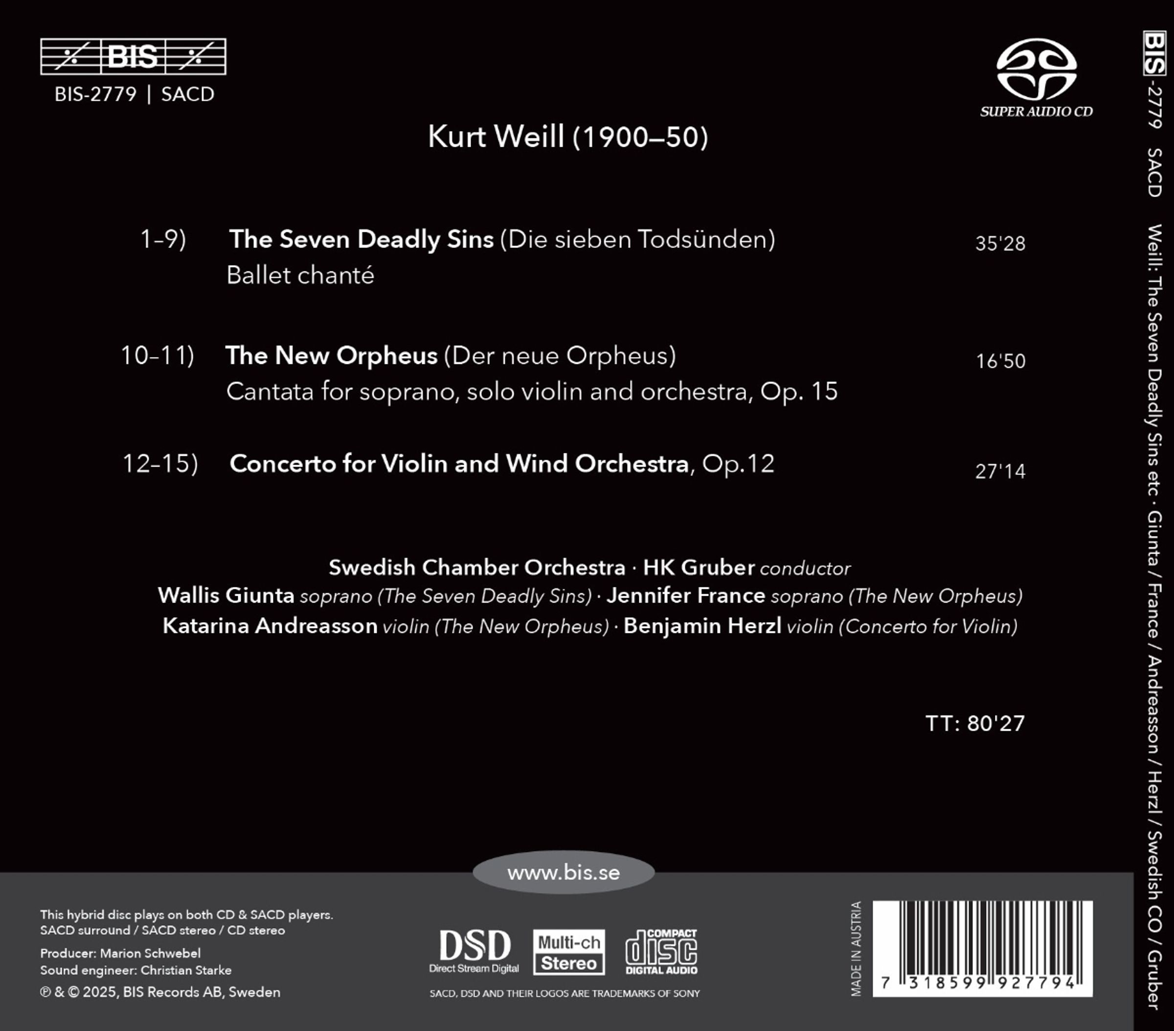 Nach seiner gefeierten Aufnahme von Kurt Weills Sinfonien Nr. 1 und 2 sowie Auszügen aus „Der silberne See“ (BIS-2579) präsentieren HK Gruber und sein kongenialer Partner, das Swedish Chamber Orchestra, drei weitere Werke des berühmten Musiktheaterkomponisten, diesmal mit den Sopranistinnen Wallis Giunta und Jennifer France sowie den Violinisten Katerina Andresson und Benjamin Herzl. Die Aufnahme beginnt mit der Ballett-Chante-Satire „Die sieben Todsünden“, einer scharfen Kritik an der kapitalistischen Gesellschaft, die den ewigen Kampf zwischen Geld und Moral thematisiert. Anna, ein junges Mädchen, wird von ihrer Familie fortgeschickt mit dem Auftrag, genug Geld zu verdienen, um ein Haus am Mississippi zu bauen. Die Kantate The New Orpheus, die die sehr unterschiedlichen Stile von Arie und Lied miteinander verbindet, erzählt die traurige Geschichte des Sängers, der sich aufmacht, die trostlosen Mauern der modernen Städte zu überwinden, um Eurydike und mit ihr die gesamte Menschheit zu retten. Schließlich zeigt das Konzert für Violine und Blasorchester, ein zentrales Werk aus Weills früher Schaffensphase, eine Theatralik, die seine späteren Bühnenwerke ankündigt. Ein spannendes Programm, das Weills unnachahmliche Sprache präsentiert, in der sich das Raffinierte und das Populäre, das Melodische und das Dissonante, das Komplexe und das Straßenkluge vermischen.