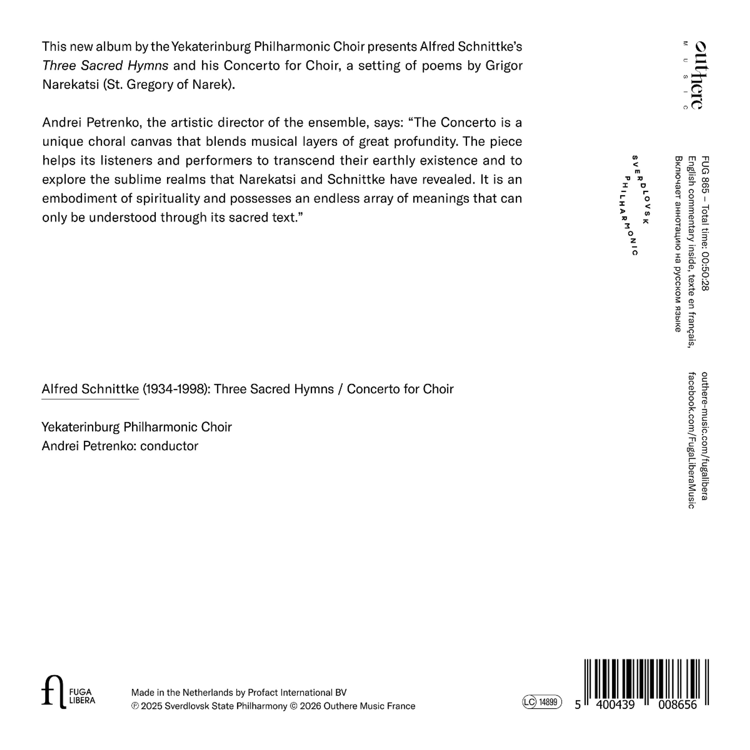 Dieses neue Album des Philharmonischen Chors Jekaterinburg präsentiert Alfred Schnittkes Drei geistliche Hymnen und sein Konzert für Chor, eine Vertonung von Gedichten von Grigor Narekatsi (St. Gregor von Narek). Andrei Petrenko, der künstlerische Leiter des Ensembles, sagt: »Das Konzert ist ein einzigartiges chorales Gemälde, das musikalische Ebenen von großer Tiefe miteinander verbindet. Das Stück hilft seinen Zuhörern und Interpreten, ihre irdische Existenz zu transzendieren und die erhabenen Sphären zu erkunden, die Narekatsi und Schnittke offenbart haben. Es ist eine Verkörperung von Spiritualität und besitzt eine unendliche Vielfalt an Bedeutungen, die nur durch seinen sakralen Text verstanden werden können.«