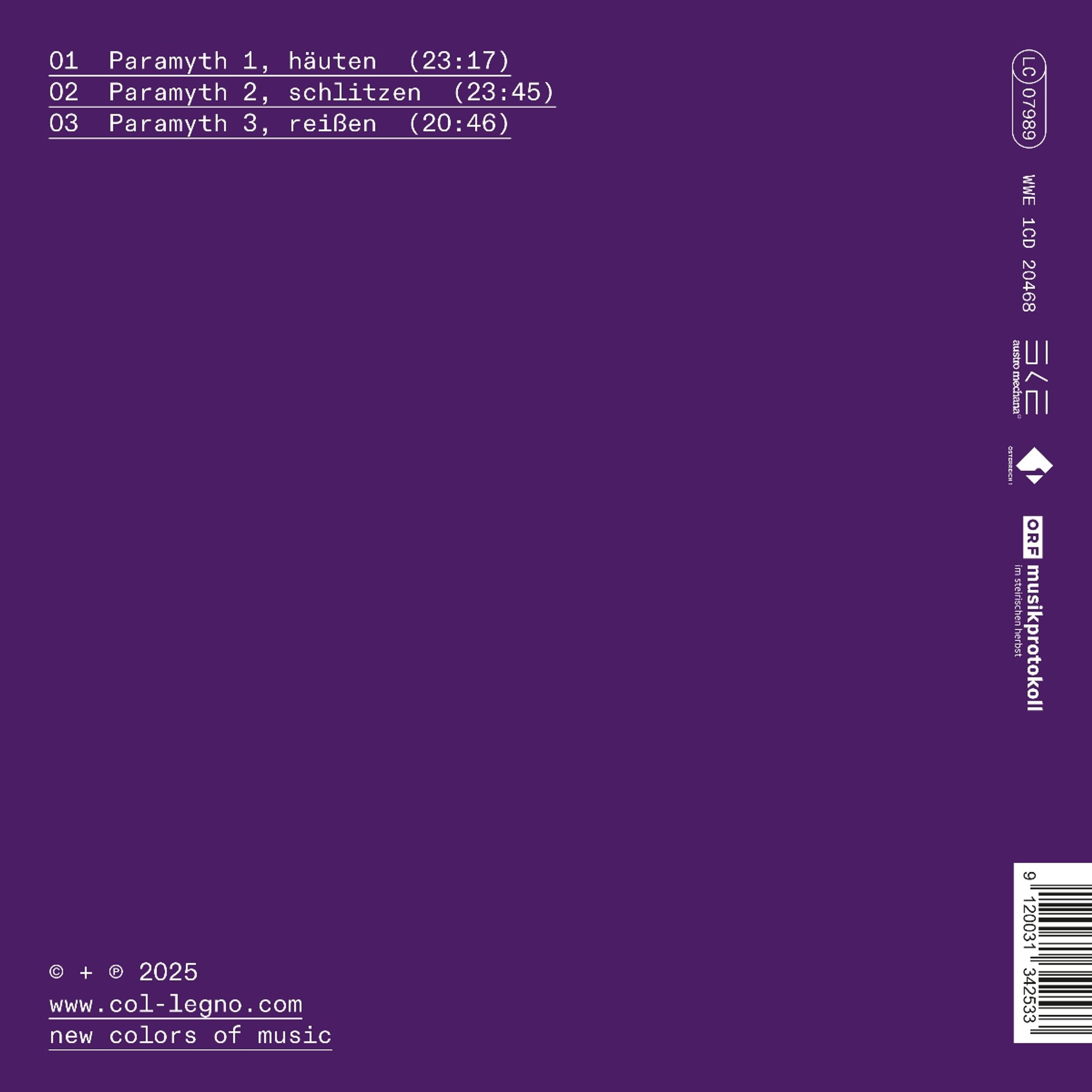 "Paramyth 1-3" ist ein Zyklus für Streichquartett, der im Laufe der Jahre im Auftrag verschiedener Festivals und für drei verschiedene Ensembles komponiert wurde. Von Anfang an war für Clemens Gadenstatter klar, dass die einzeln komponierten Stücke insgesamt einen Zyklus ergeben sollten. Einige Jahre nach den einzelnen Uraufführungen wurde am 09.10.2020 erstmals der gesamte Zyklus vom Arditti Quartet zur Aufführung gebracht. Konzeptueller Ausgangspunkt von "Paramyth 1-3" sind grundlegende menschliche Tätigkeiten, die vollzogen oder gedacht werden können, jedoch weniger erlebt werden wollen, wie das Häuten, das Schlitzen und das Reißen. Vor allem drei Gemälde veranschaulichen die Aspekte auf besondere Art: "Die Schindung des Marsyas" von Tizian, die Kreuzigungstafel des Isenheimer Altars von Matthias Grünewald und die Studie nach Velazquez' Portrüt von Papst Innozenz X. von Francis Bacon. "Paramyth 1-3" ist die Vertonung dieser drei Erfahrungen und deren Verdichtung in der Kunst. Clemens Gadenstätter (* 1966) ist ein österreichischer Komponist und Dirigent, der Kompositionsaufträge von vielen bedeutenden Institutionen und Klangkörpern erhält, darunter die Musik-Biennale Berlin, die Salzburger Festspielen, der Südwestrundfunk (Donaueschinger Musiktage 2001, 2005, 2012) und der ORF. Das Arditti Quartett ist ein 1974 gegründetes Streichquartett mit Schwerpunkt auf der Musik des 20. und 21. Jahrhunderts. Hunderte von Kompositionen wurden dem Quartett gewidmet, von namhaften Komponisten wie Benjamin Britten, John Cage und György Ligeti.