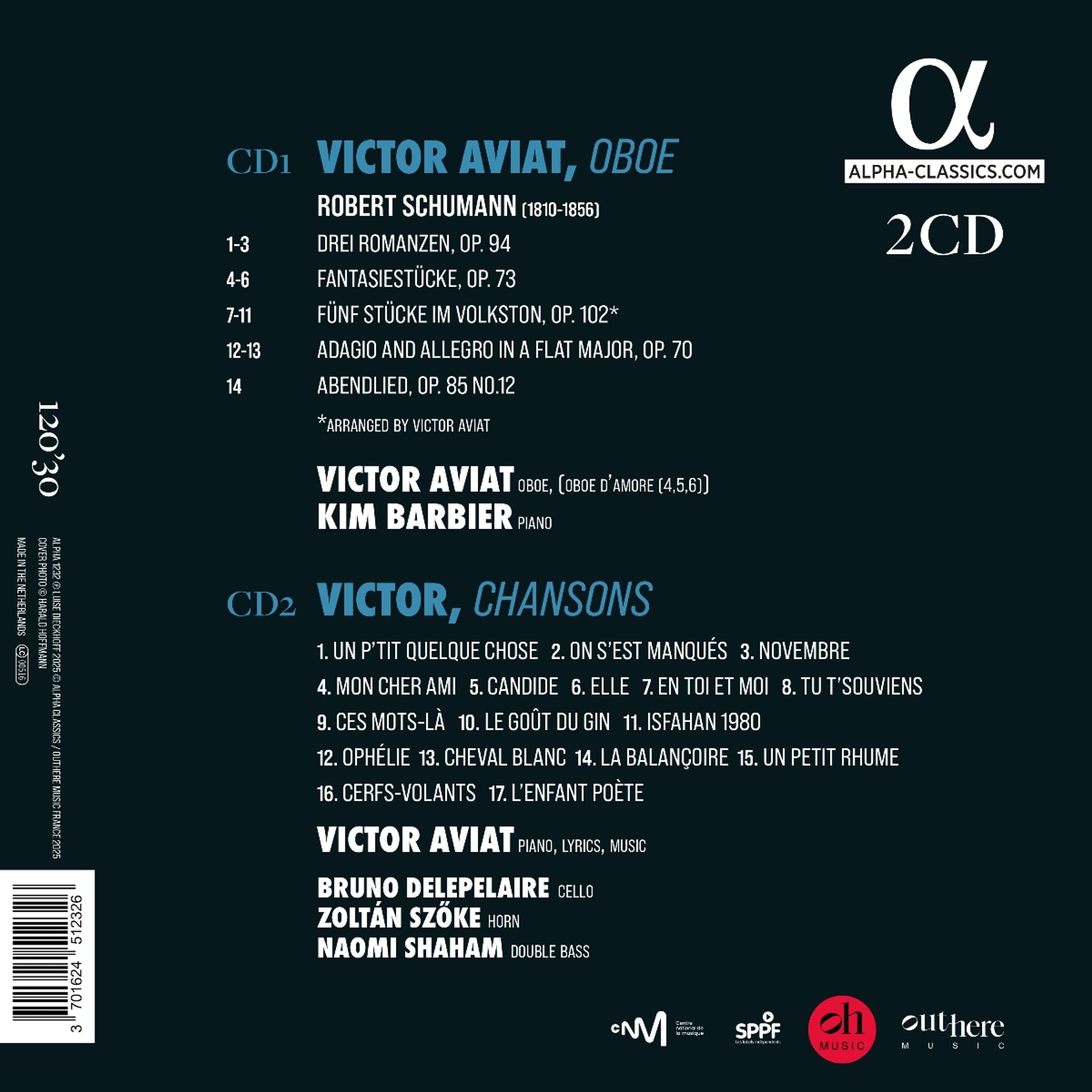 "Victor Aviat: Un Portrait" in weißer Schrift. Ein Mann in dunklem Anzug sieht nach links. Oben rechts ist ein Alpha-Logo., 2 CDs