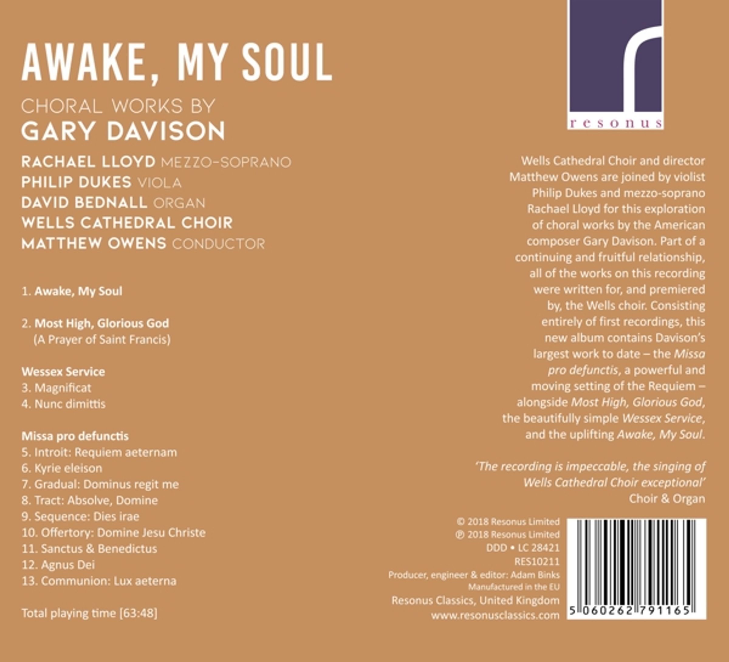 Im Rahmen einer kontinuierlichen und fruchtbaren Zusammenarbeit wurden alle Werke dieser Aufnahme für den Wells Cathedral Choir geschrieben und von ihm uraufgeführt. Dieses neue Album besteht ausschließlich aus Ersteinspielungen und enthält Davisons bisher umfangreichstes Werk – die Missa pro defunctis, eine kraftvolle und bewegende Vertonung des Requiems – sowie »Most High, Glorious God«, den wunderbar schlichten Wessex Service und das erhebende »Awake, My Soul«.