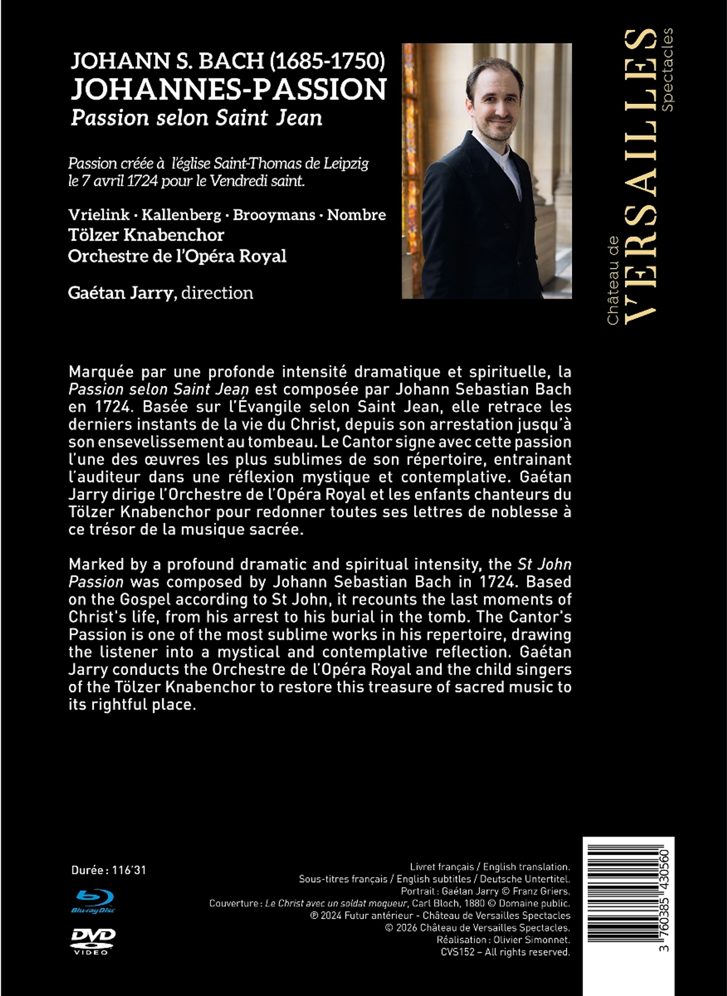 Die Johannespassion, die sich durch eine tiefgreifende dramatische und spirituelle Intensität auszeichnet, wurde 1724 von Johann Sebastian Bach komponiert. Basierend auf dem Johannesevangelium erzählt sie die letzten Momente im Leben Christi, von seiner Verhaftung bis zu seiner Beisetzung im Grab. Die Kantorenpassion ist eines der erhabensten Werke in seinem Repertoire und versetzt den Zuhörer in eine mystische und kontemplative Stimmung. Gaétan Jarry dirigiert das Orchestre de l’Opéra Royal und die Kindersänger des Tölzer Knabenchors, um diesem Schatz der geistlichen Musik seinen rechtmäßigen Platz zurückzugeben.
