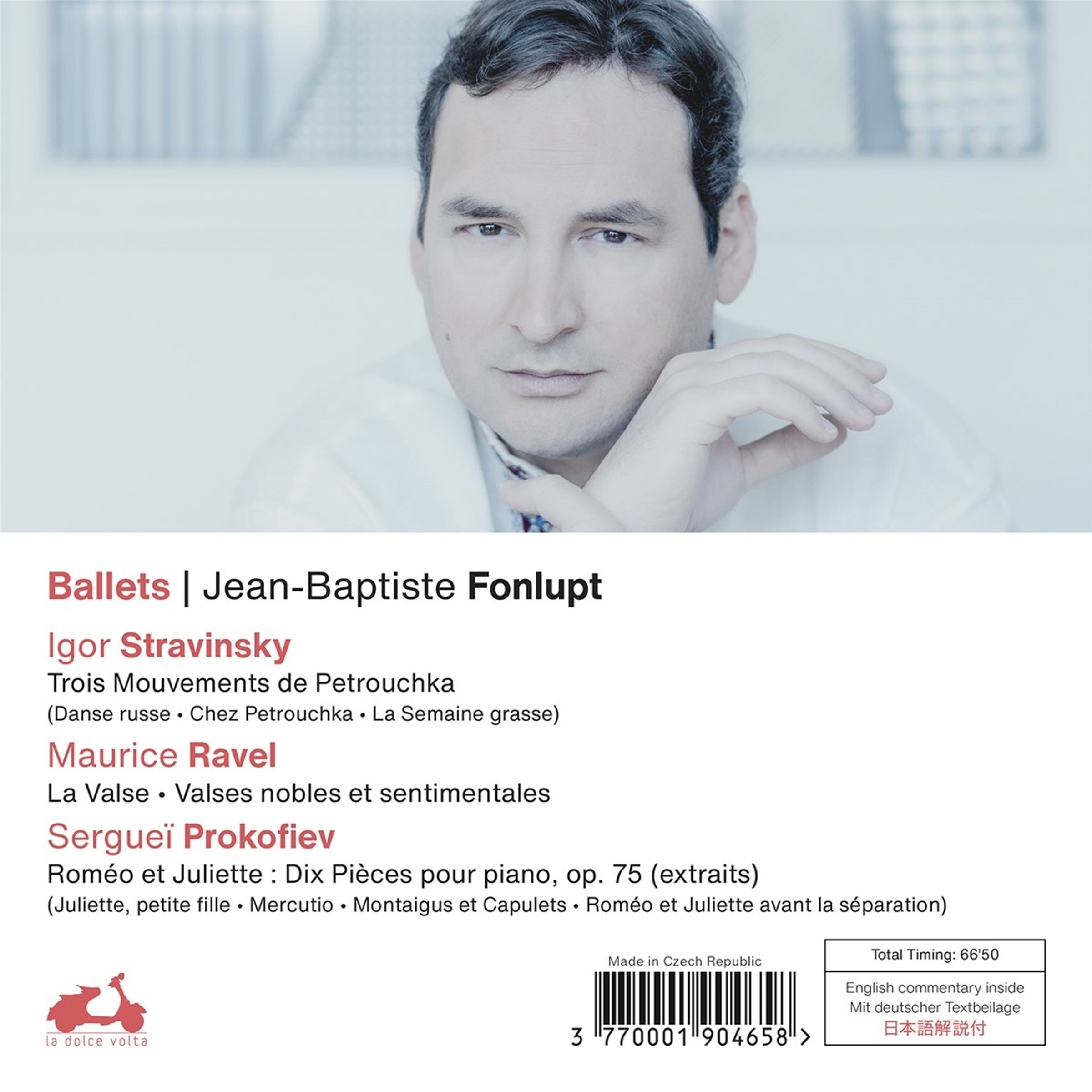 Der französische Pianist Jean-Baptiste Fonlupt präsentiert Ballettmusik. Zweierlei Ansätze leiteten ihn bei seiner Auswahl: Musik, die ursprünglich für Orchester komponiert wurde und später für Klavier bearbeitet wurde, und Klavierwerke, die später orchestriert wurden – in beiden Fällen vom Komponisten selbst. Während Strawinskys Petruschka und Prokofjews Romeo und Julia Ballettklassiker sind, ist weniger bekannt, dass Ravels La Valse von Diaghilev, dem berühmten russischen Ballettimpresario in Paris, beauftragt wurde (und dann abgelehnt). Und der Komponist orchestrierte auf Anfrage der Tänzerin Natalja Truchanowa seine Valses nobles et sentimentales als Ballettmusik.