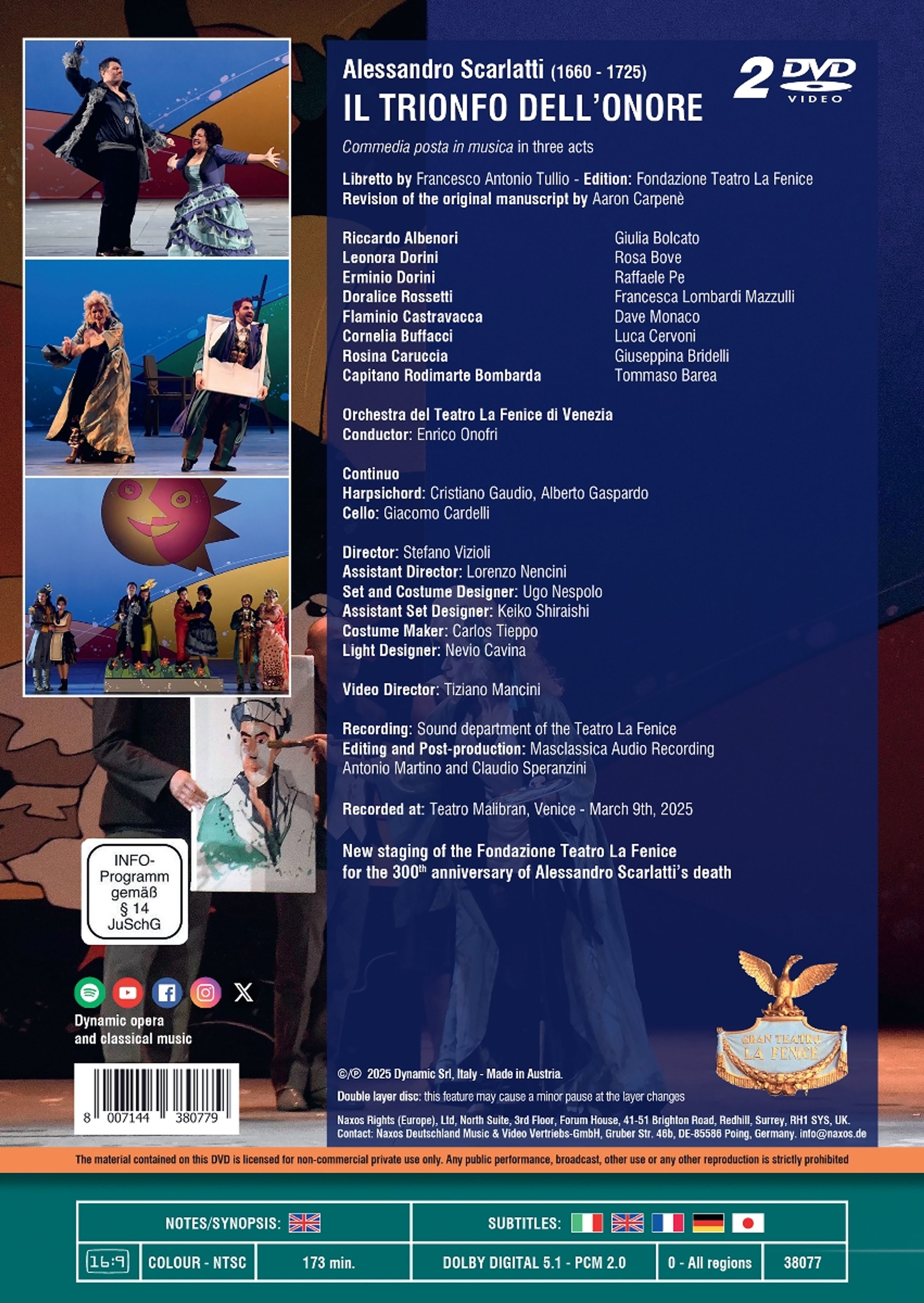 Alessandro Scarlattis "Il trionfo dell'onore" (Der Triumph der Ehre) - seine einzige komische Oper - wurde 1718 in Neapel uraufgeführt. Mit ihren charakteristischen Rezitativen und ausdrucksstarken Arien und einer Handlung über vier Liebespaare, kann sie als eine der Vorläuferinnen der Opera buffa angesehen werden. Die Hauptfigur ist der unverbesserliche Verführer Riccardo Albenori, eine Don Giovanni-ähnliche Figur, allerdings ohne die bösartige Aura. In dieser Oper besticht Scarlatti nicht nur durch einfühlsame Psychologie, sondern auch durch eine reiche Vielfalt an Arien, Duetten und Quartetten, die sowohl Pathos als auch Humor und Erotik des Werks ausmachen. Die Presse lobte die Regie von Stefano Vizioli und die farbenfrohen Bühnenbilder und Kostüme von Ugo Nespolo. Der Dirigent Enrico Onofri wurde dafür gelobt, dass er dem Orchestra del Teatro La Fenice eine Vitalität verlieh, die mit den spritzigen Gesangsnummern harmonierte.