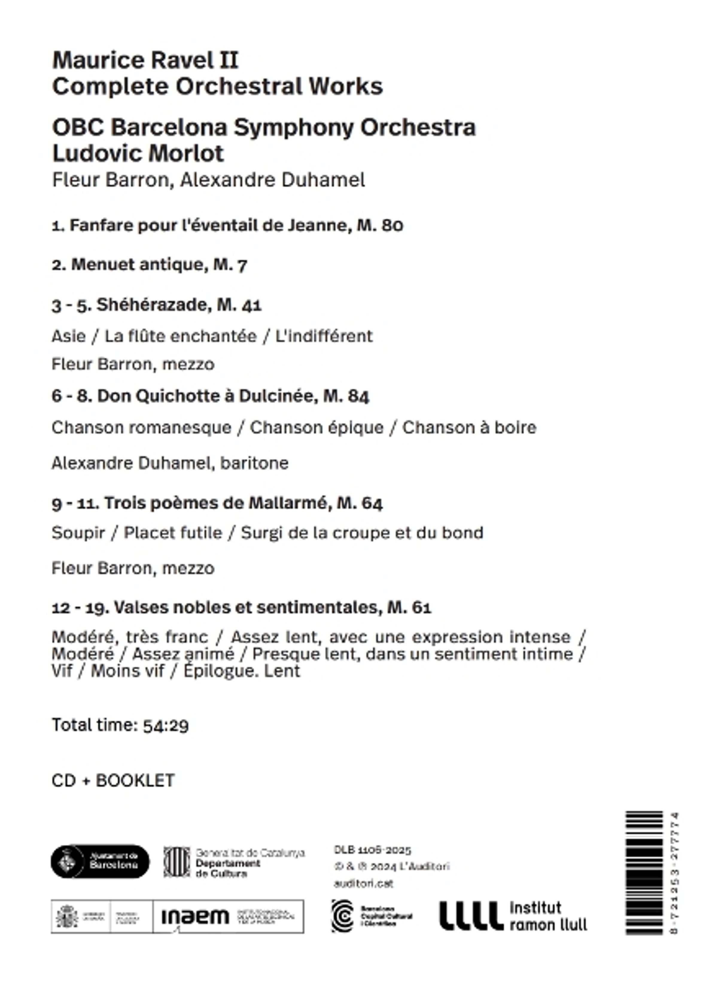 Das Orquesta Sinfónica de Barcelona (OBC) und Musikdirektor Ludovic Morlot veröffentlichen in sechs Volumina das gesamte Orchesterwerk von Maurice Ravel. Teil 2 enthält sechs Werke des französischen Komponisten mit spanischen Wurzeln: die nahezu unbekannte »Fanfare for l'éventail de Jeanne«, das »Menuet antique«, die Ouvertüre »Shéhérazade«, die Liederzyklen »Don Quichotte à Dulcinée« und »Trois poèmes de Stéphane Mallarmé« und die beliebten »Valses nobles et sentimentales«. Die Mezzosopranistin Fleur Bazzon (Shéhérazade, Trois poèmes) und der Bariton Alexandre Duhamel (Don Quichotte) übernehmen die Vokal-Parts.
