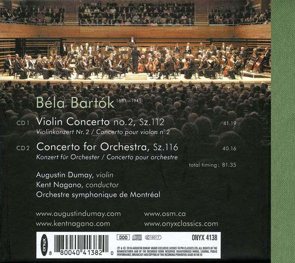 Sowohl Bartoks zweites Violinkonzert als auch das Konzert für Orchester sind heute Standardwerke der Klassischen Moderne. Mit Augustin Dumay und dem Orchestre symphonique de Montréal unter Kent Nagano erfahren die beiden Klassiker eine Interpretation, die Raum sowohl für subtile Ausleuchtung wie für die großflächige Wirkung bietet.
