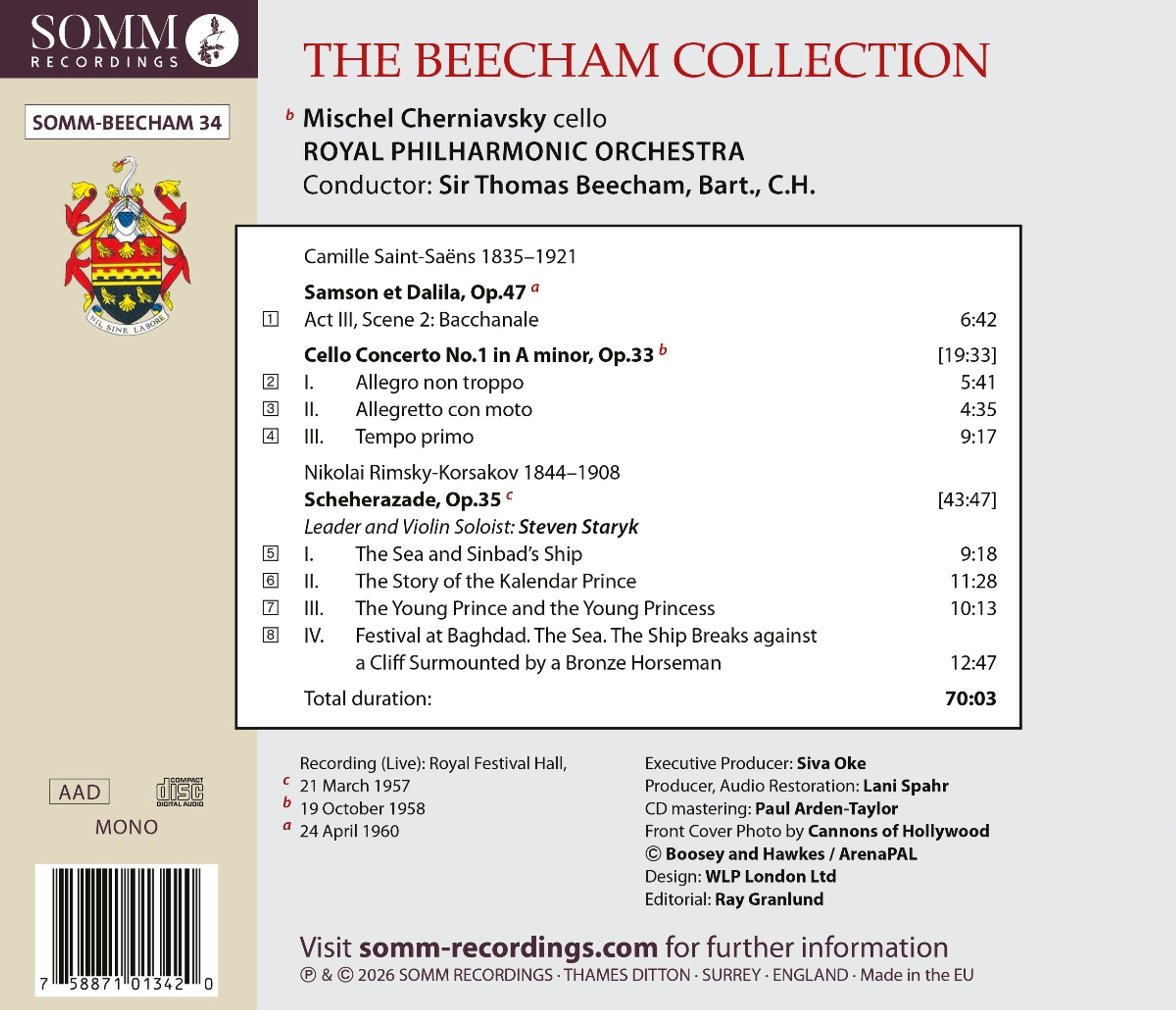 Am 24. April 1960 gab der 80-jährige Sir Thomas Beecham in der Festival Hall das letzte Konzert, das er mit dem Royal Philharmonic Orchestra in London dirigierte. Das letzte Werk aus diesem historischen Programm ist die "Bacchanale" aus der Oper "Samson et Dalila" von Camille Saint-Saens. Was das Publikum bei seinem stürmischen Applaus nicht wusste, war, dass diese Aufführung den Abschied von Beecham von der Londoner Konzertbühne bedeutete. Im Juni 1960 erlitt er eine Hirnthrombose und dirigierte nie wieder; er starb am 8. Marz 1961. Die hier vorliegende historische Veröffentlichung enthält auch Live-Aufnahmen des ersten Cellokonzerts von Saint-Saens und der "Scheherazade" von Nikolai Rimsky-Korsakow. Die Audio-Restaurierung wurde wieder einmal von dem renommierten Tontechniker Lani Spahr vorgenommen, dessen Arbeit kürzlich mit vier 'Gramophone Magazine Editor's Choice Awards' ausgezeichnet wurde. Bei Saint-Saëns' erstem Cellokonzert von 1958 spielt der in der Ukraine geborenen Solist Mischel Cherniavsky. Mischel Cherniavsky stammte aus einer Familie mit neun musikalisch begabten Kindern und spielte von 1901 bis 1934 mit zwei seiner Brüder im Cherniavsky-Trio, danach lebte er hauptsächlich in London und Frankreich. Die Live-Aufführung von Rimski-Korsakows Scheherazade auf dieser Veröffentlichung wurde am 21. März 1957 in der Royal Festival Hall gegeben. Was Rimski-Korsakow als die "verschiedenen märchenhaften Wunder" beschrieb, die er im Sinn hatte, als er das Werk komponierte, kommt in Beechams Live-Aufführung mit einer Frische und Brillanz herüber, die das Werk zu einem unvergesslichen Erlebnis macht.