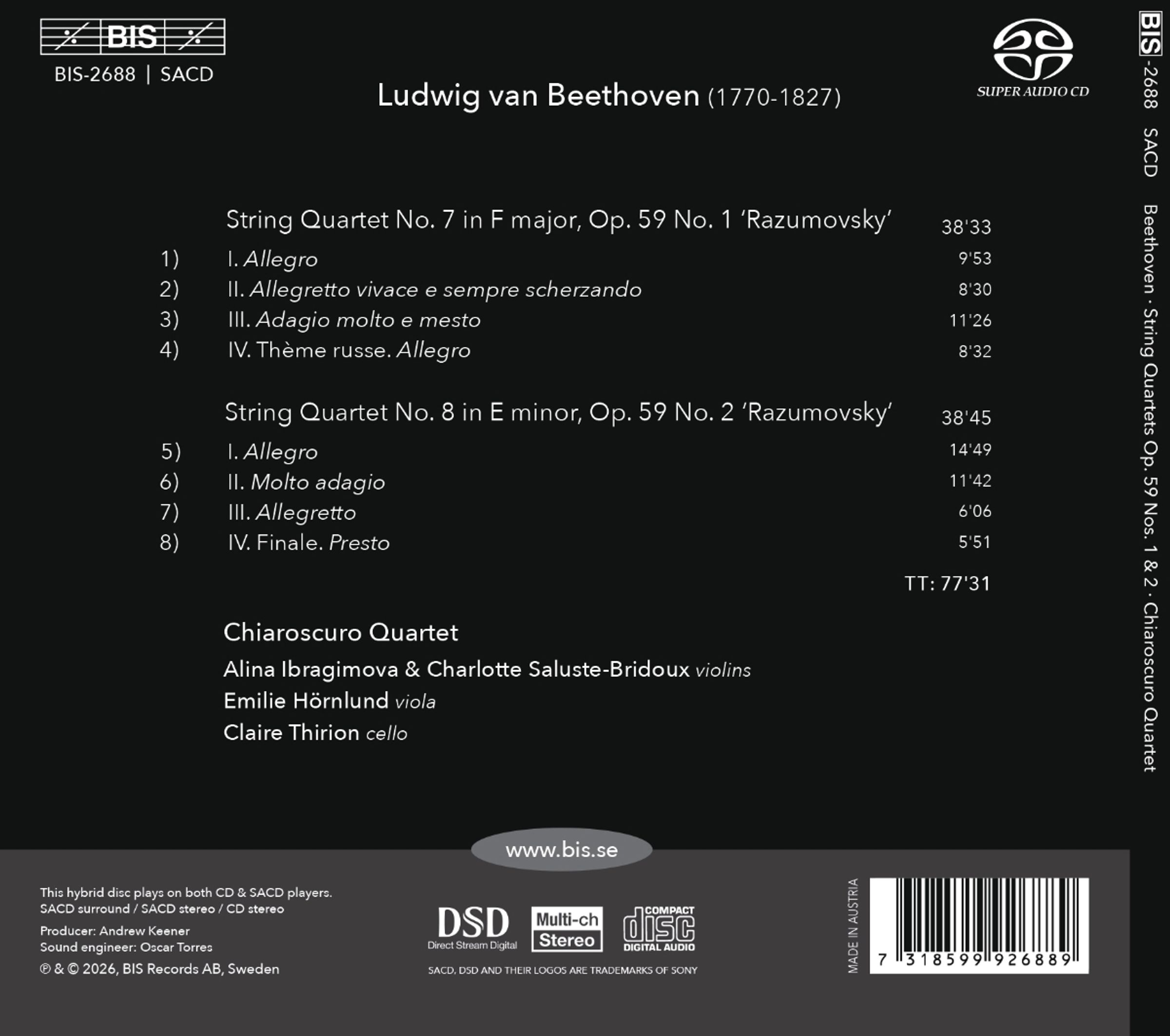 Das Chiaroscuro Quartett präsentiert uns nun den vierten Teil seiner derzeit entstehenden Gesamtaufnahme der Streichquartette von Ludwig van Beethoven. Diese neueste Veröffentlichung konzentriert sich auf die ersten beiden der drei Quartette aus Opus 59, die als "Razumovsky-Quartette" bekannt sind und nach ihrem Mäzen, dem russischen Botschafter in Wien, Graf Andreas Razumovsky, benannt sind, der in seinem Palast ein Quartett unterhielt. Beethoven war besonders stolz auf diese neuen Quartette, obwohl sie zunächst bei Publikum, Kritikern und sogar Interpreten Verwirrung stifteten. Als sich ein Geiger über ihre Schwierigkeit beklagte, entgegnete Beethoven bekanntlich: 'Oh, sie sind nicht für Sie, sondern für eine spätere Zeit.' Das erste in F-Dur war mit ziemlicher Sicherheit das bis dahin längste Streichquartett, und seine beispiellose Schwere und Dichte brachten ihm unter Beethovens Quartetten den Beinamen "Eroica" ein. Das zweite in e-Moll wird oft als 'enger Verwandter' der 'Appassionata'-Sonate beschrieben, da beide Werke - die etwa zur gleichen Zeit komponiert wurden - von Anfang bis Ende von einer tiefen Dunkelheit durchdrungen sind. Die bisherigen Veröffentlichungen des Chiaroscuro Quartetts in diesem Zyklus wurden von der Musikpresse bereits mit höchstem Lob bedacht und als 'atemberaubend', 'vor Spannung und jugendlicher Vitalitat sprühend' sowie als 'ein ganz besonderes Erlebnis' gepriesen. Es besteht kein Zweifel, dass auch diese neueste Veröffentlichung ähnliches Kritikerlob erhalten wird.