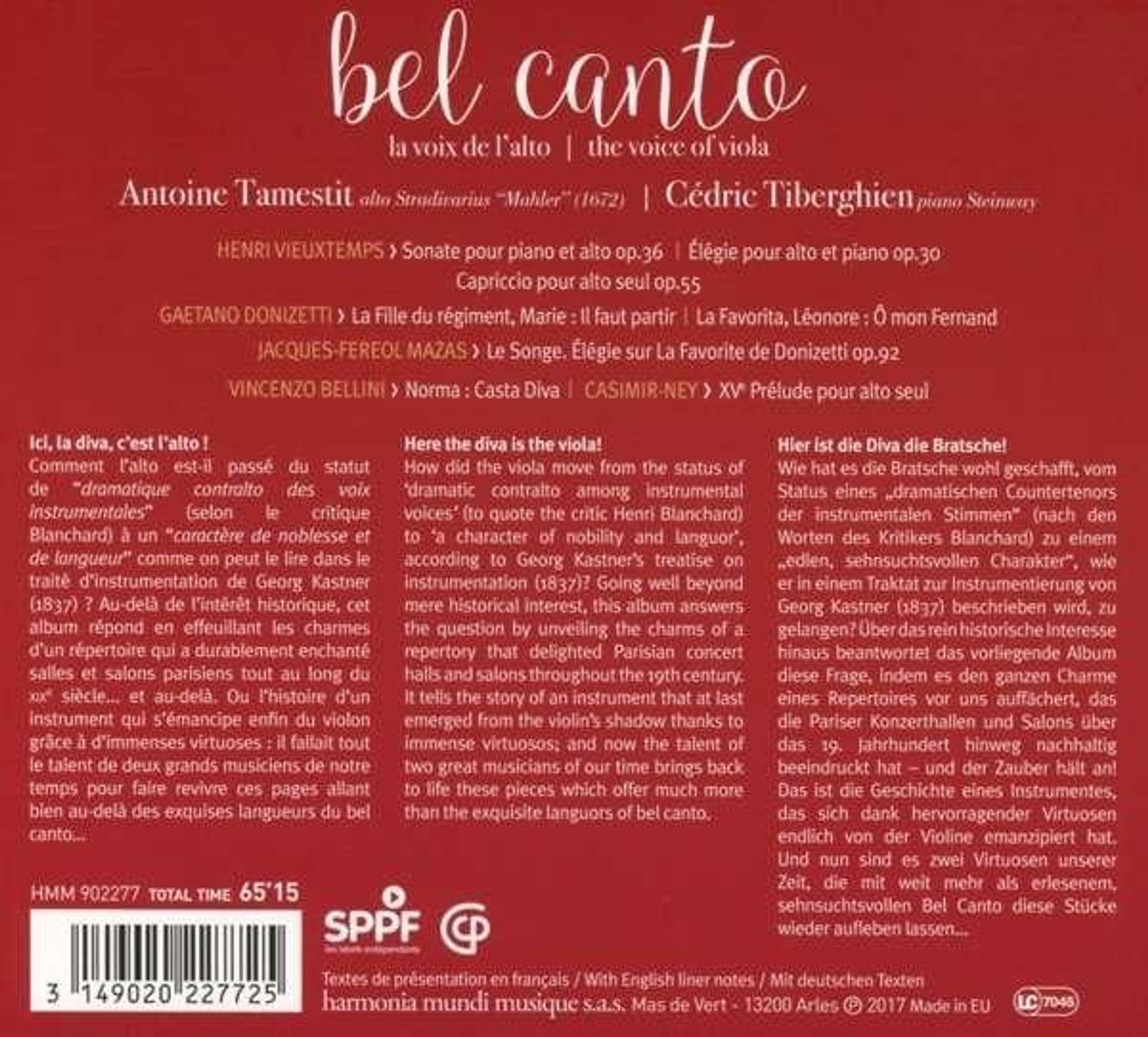 Wie hat es die Bratsche geschafft, vom Status eines »dramatischen Alts unter den instrumentalen Stimmen« (nach den Worten des Kritikers Blanchard) zu einem »edlen, sehnsuchtsvollen Charakter«, wie er in einem Traktat zur Instrumentierung von Georg Kastner (1837) beschrieben wird, zu gelangen? Über das rein historische Interesse hinaus beantwortet das vorliegende Album diese Frage, indem es den ganzen Charme eines Repertoires vor uns auffächert, das die Pariser Konzertsäle und Salons über das 19. Jahrhundert hinweg nachhaltig beeindruckt hat – und der Zauber hält an! Das ist die Geschichte eines Instrumentes, das sich dank hervorragender Virtuosen endlich von der Violine emanzipiert hat. Und nun sind es zwei Virtuosen unserer Zeit, die mit weit mehr als erlesenem, sehnsuchtsvollen »Bel Canto« diese Stücke wieder aufleben lassen ... Die Diva ist die Bratsche; ihr zu Diensten steht Antoine Tamestit, der hier sein erstes Solo-Album für harmonia mundi einspielt.