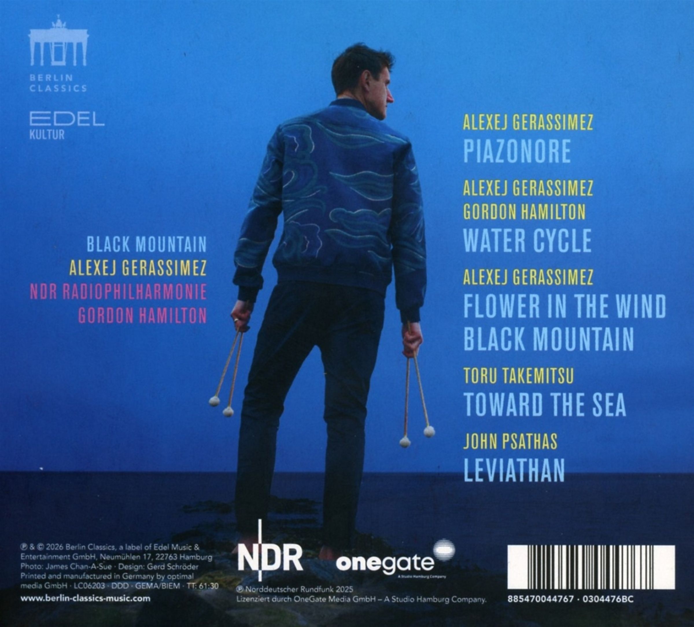 ALEXEJ GERASSIMEZ, BLACK MOUNTAIN, NDR Radiophilharmonie, Gordon Hamilton. Mann auf Felsen mit Drumsticks, blaues Design., CD