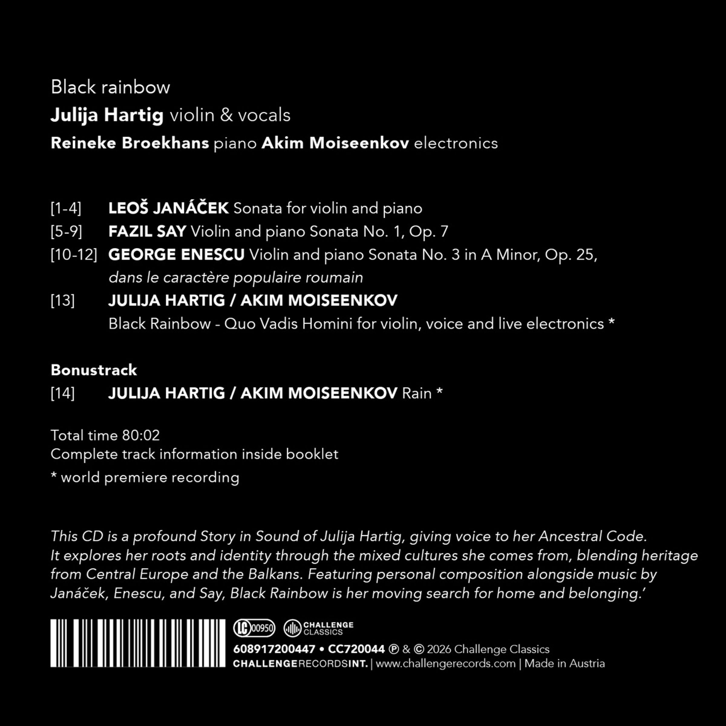 Texte: "Janáček | Say | Enescu | Hartig | Moiseenkov - Black Rainbow." Frau vor gelbem Wirbel in schwarzem Hintergrund., CD