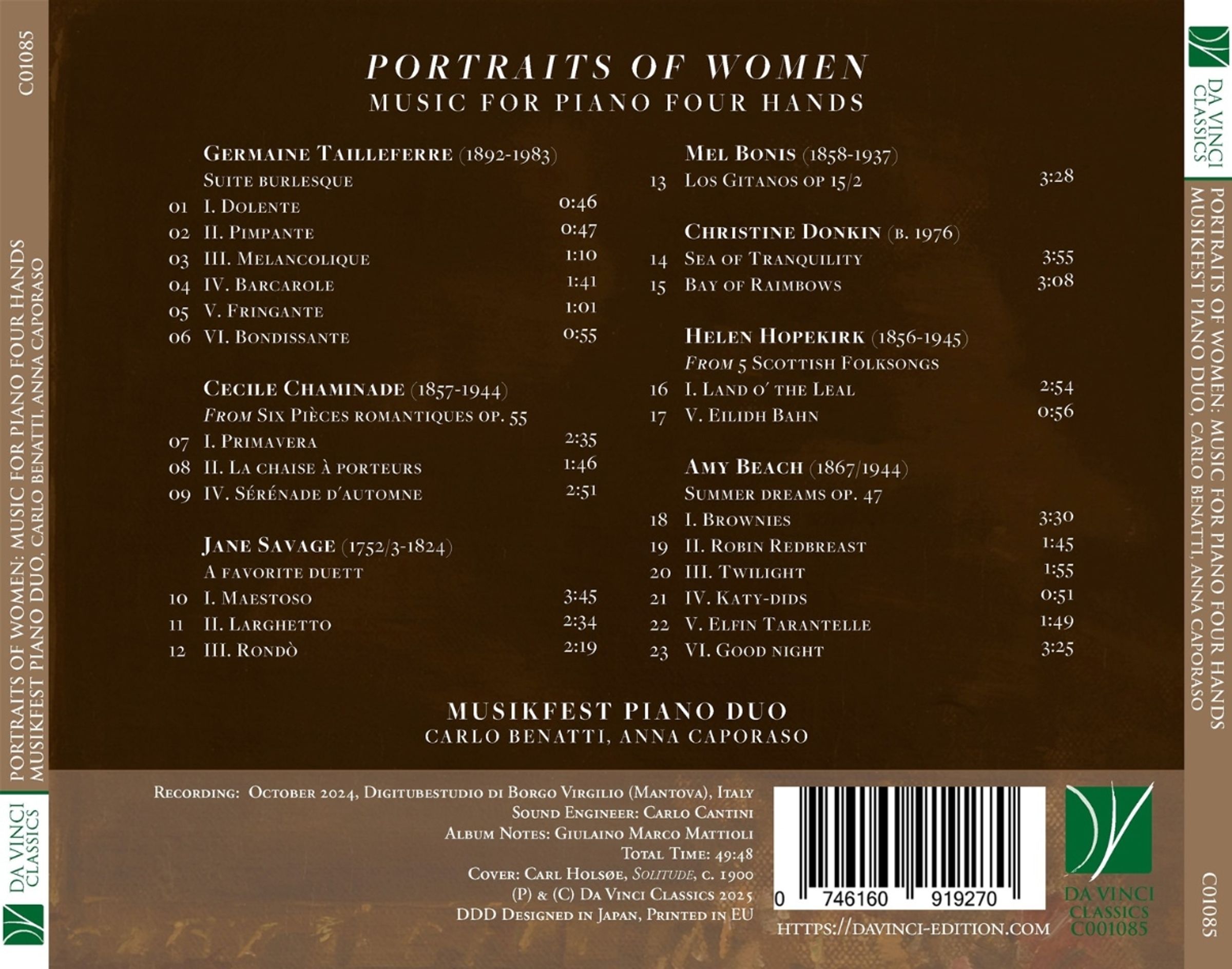 Die kreative Reise der Komponistinnen, die in diesem Aufnahmeprojekt vorgestellt werden, erstreckt sich über zwei Jahrhunderte. Jedes Stück trägt dazu bei, das Bild der Komponistinnen zwischen dem 19. und 20. Jahrhundert zu prägen. Eine Rolle, die sich von einer marginalen Präsenz zu einer anerkannten kreativen Kraft entwickelte. Diese Komponistinnen lebten in einer Zeit, in der ihnen eine öffentliche Karriere oft verwehrt blieb. Viele widmeten sich dem Klavier – dem häuslichen Instrument par excellence – und schrieben zahlreiche Stücke für vierhändiges Klavier, ein Repertoire, das intim und vertraut war, aber nicht ohne künstlerischen Anspruch.
