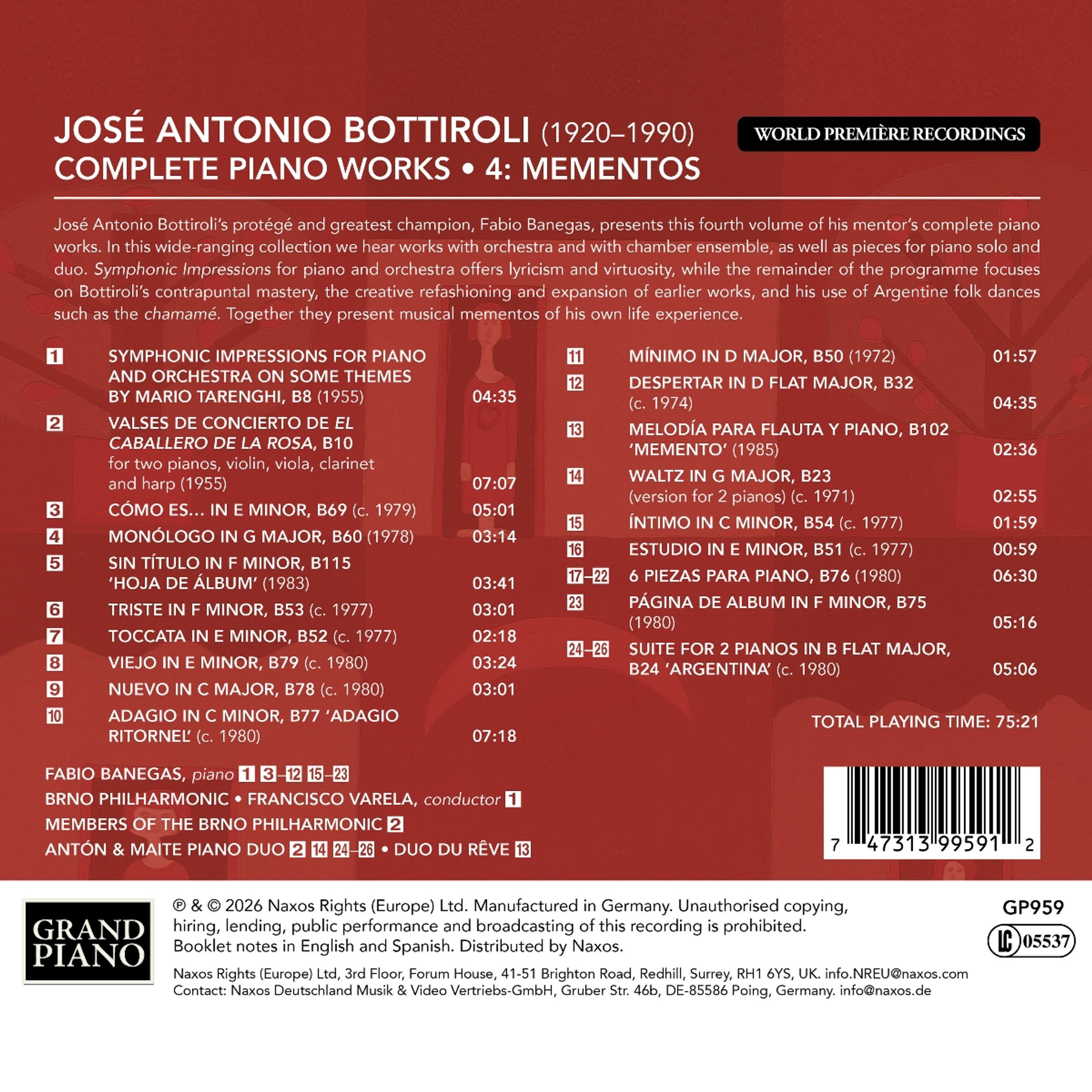 Jose Antonio Bottirolis Schützling und größter Fürsprecher, Fabio Banegas, präsentiert diesen vierten Teil der vollständigen Klavierwerke seines Mentors. In dieser breit gefächerten Sammlung spielt er Werke mit Orchester und Kammerensemble sowie Stücke für Klavier solo und Duo. "Symphonic Impressions" für Klavier und Orchester bietet Lyrik und Virtuosität, während sich der Rest des Programms auf Bottirolis kontrapunktische Meisterschaft, die kreative Neugestaltung und Erweiterung früherer Werke und seine Bearbeitung argentinischer Volkstänze wie dem Chamame konzentriert. Bottirolis komponierte 70 Klavierwerke, 23 Kammermusikwerke, 8 Chorwerke und 12 sinfonische Werke, aber er schrieb auch 84 Gedichte und andere literarische Arbeiten. Fabio Banegas, Gewinner des Global Music Award "Outstanding Achievement" ist ein etablierter argentinisch-amerikanischer klassischer Pianist und Musikverleger. Als Preisträger des Mozarteu Santa Fe-Wettbewerbs und des Redfield Award der Philharmonic Society of Orange County ist er in Europa und Amerika aufgetreten. Seine Diskografie, umfasst zahlreiche Weltpremieren. Neben den gesamten Klavierwerken von José Antonio Bottiroli hat er Stücke von Eduardo Grau, Nicolás Alfredo Alessio und Jacobo Ficher sowohl auf Tonträgern als auch in Live-Aufführungen uraufgeführt. 2011 stellte Banegas das Gesamtwerk von Bottiroli zusammenund katalogisierte es.
