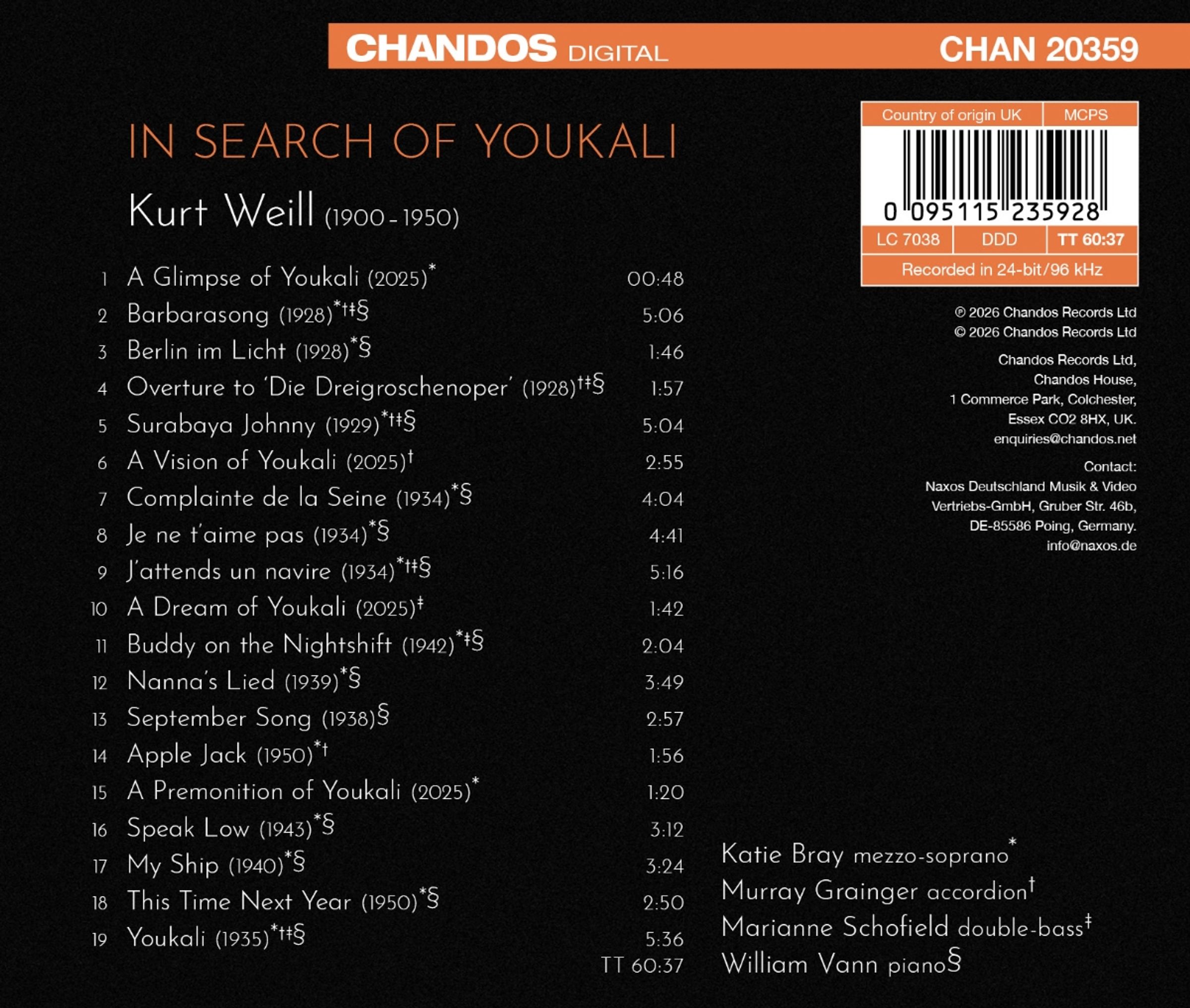 Die britische Mezzosopranistin Katie Bray, Gewinnerin des Dame Joan Sutherland Publikumspreises beim 'BBC Cardiff Singer of the World'-Wettbewerb, ist bekannt für ihre magnetische Bühnenpräsenz und ihren strahlenden, ausdrucksstarken Klang. Katie schreibt über "Youkali": Dieses Lied war vor mehr als zwanzig Jahren meine erste Begegnung mit Kurt Weill, und seitdem begleitet mich dieser sehnsüchtige, hypnotisierende Tango. Die Stimmung von "Youkali" hat mich tief berührt und schien Weills eigene Suche nach einem Ort der persönlichen und künstlerischen Freiheit widerzuspiegeln, einem deutschen Juden, der 1933 aufgrund des Aufstiegs des Nazi-Regimes ins Exil gezwungen wurde. Er zog um die ganze Welt, und mit jedem neuen Land kam eine Neuerfindung seiner selbst und eine weitere wundersame musikalische Verwandlung. "Youkali" ist Weills "Somewhere over the rainbow", eine Idee, die mich sehr anspricht und die mir, während ich dies im Jahr 2025 schreibe, in einer Welt, die erneut im Krieg steht, schmerzlich relevant erscheint. Meine Interpretationen von Weills Liedern drehten sich immer um "Youkali" und Weills Suche nach einem Ort, an den er gehört und an dem er frei sein kann. Ich wollte dieses Album schon seit vielen Jahren machen und bin begeistert, dass ich endlich die Gelegenheit dazu hatte, gemeinsam mit einem so besonderen Team von Mitwirkenden und Freunden. Es ist meine Hommage an Kurt Weill, das Chamäleon, in seiner ganzen Pracht, und eine Hommage an uns alle auf unserer Suche nach Güte, Liebe und Frieden.